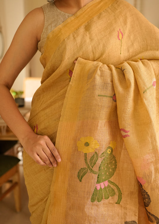 Golden Grace Hand-Embroidered Tissue Linen Saree