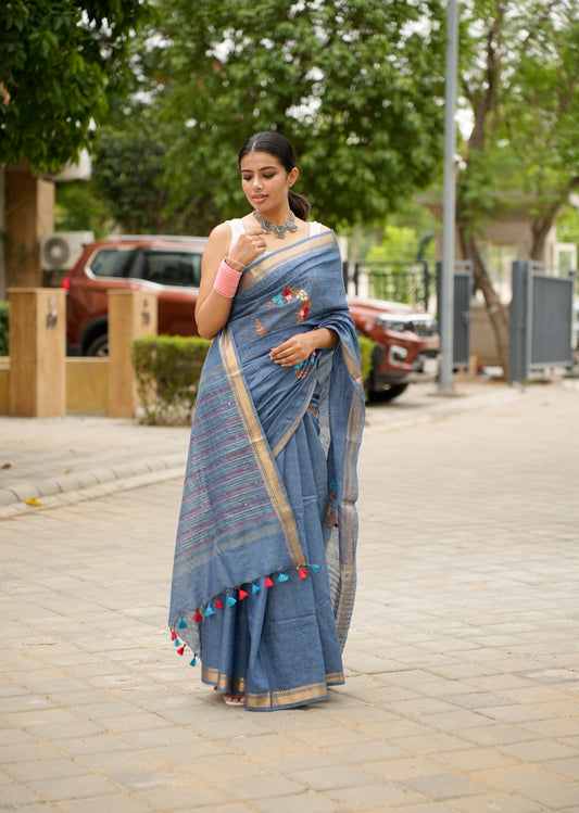 Handwoven Blue Linen Saree with Tassel & Hand Embroidery