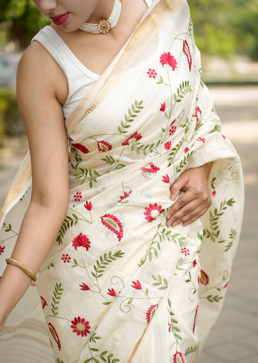 Red & White Blush Bloom Linen Saree With Hand Embroidery