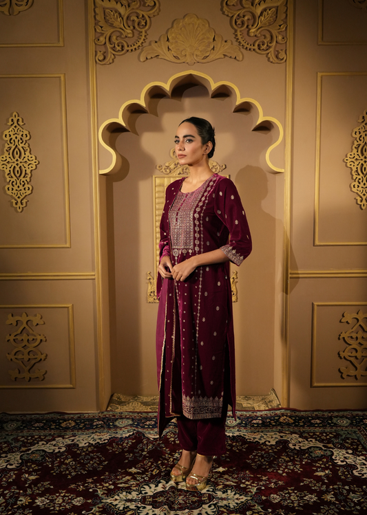 Wine & Gold-Toned Velvet Kurta Set With Dupatta