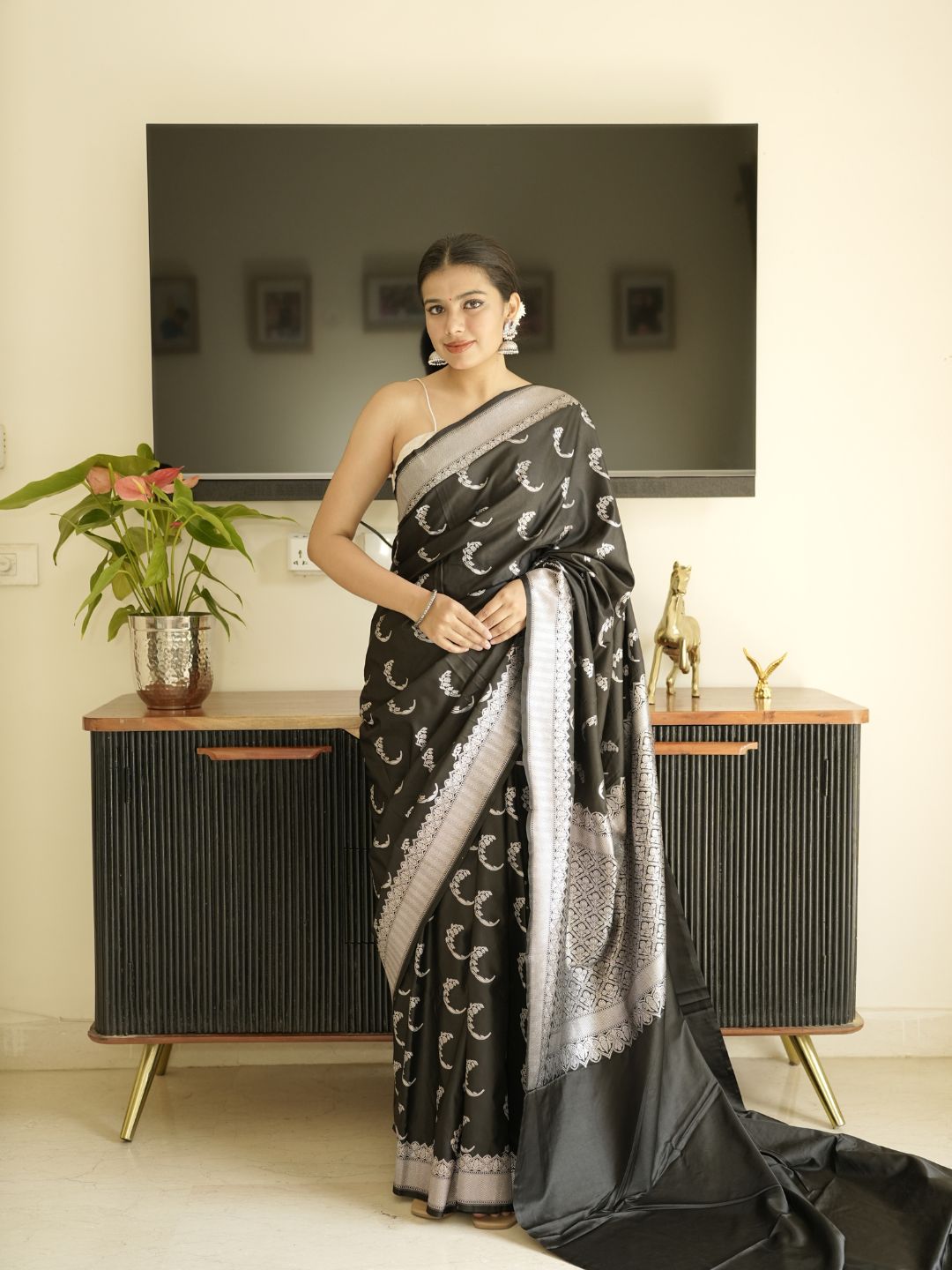To ensure a sleek and polished look with this modern saree, choose a fitted, lightweight petticoat in a neutral tone of Black, which won’t distract from the saree’s vibrancy. The saree should be draped with crisp pleats at the waist, and the pallu should fall gracefully over the shoulder, with minimal pinning to allow the fabric to flow naturally. A form-fitting blouse, preferably with a modern cut like a halter or keyhole neckline, will keep the look streamlined and stylish.