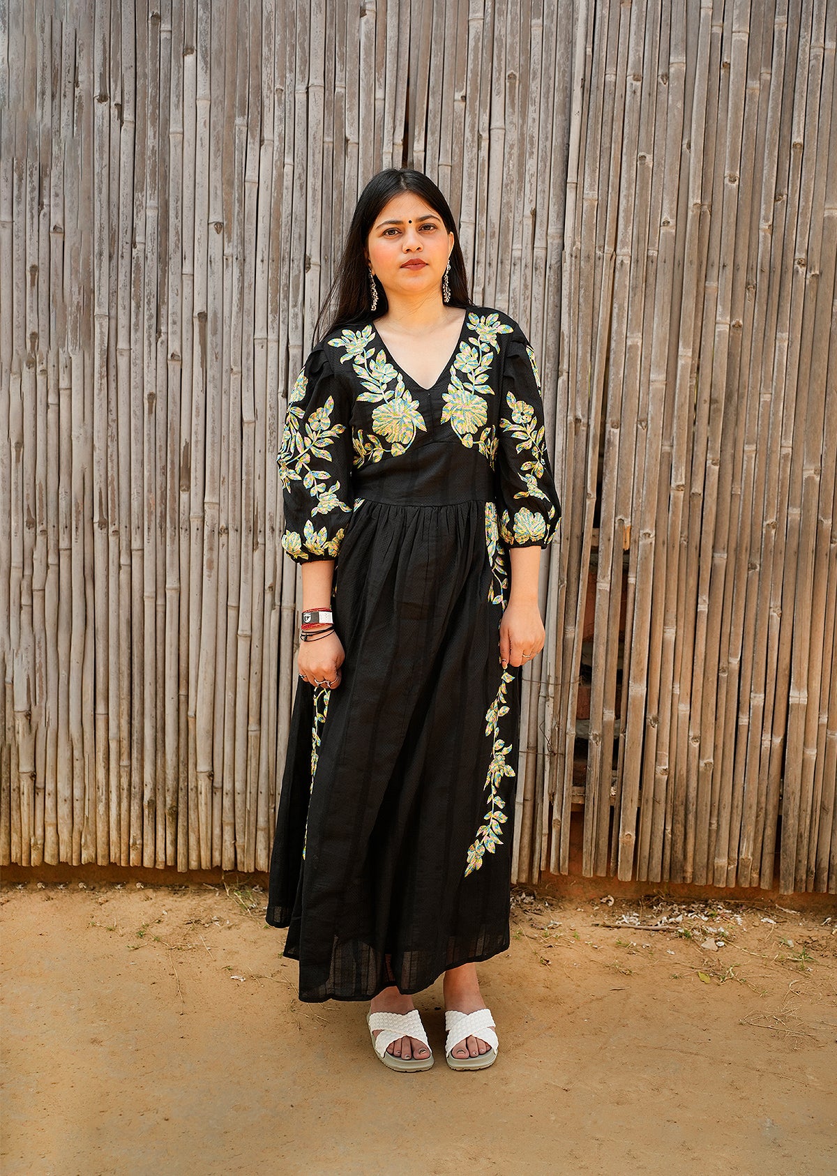 This graceful black cotton dress features intricate floral embroidery in subtle hues of green and gold, giving it a sophisticated yet vibrant touch. Designed for women who love elegance with comfort, the dress flaunts carefully crafted embroidery on the front, sleeves, and side panels, making it a perfect choice for casual outings, festive gatherings, or brunch dates.