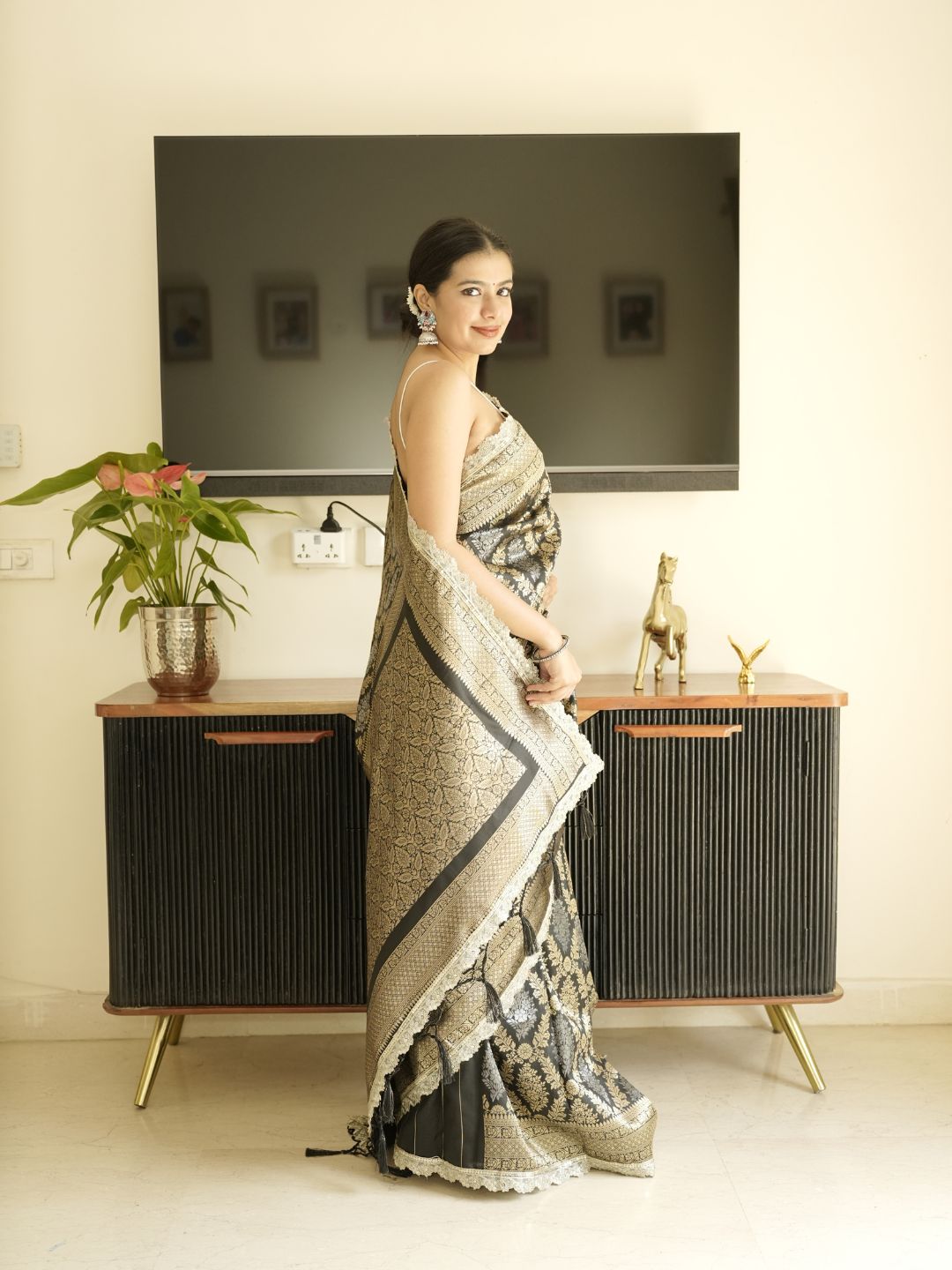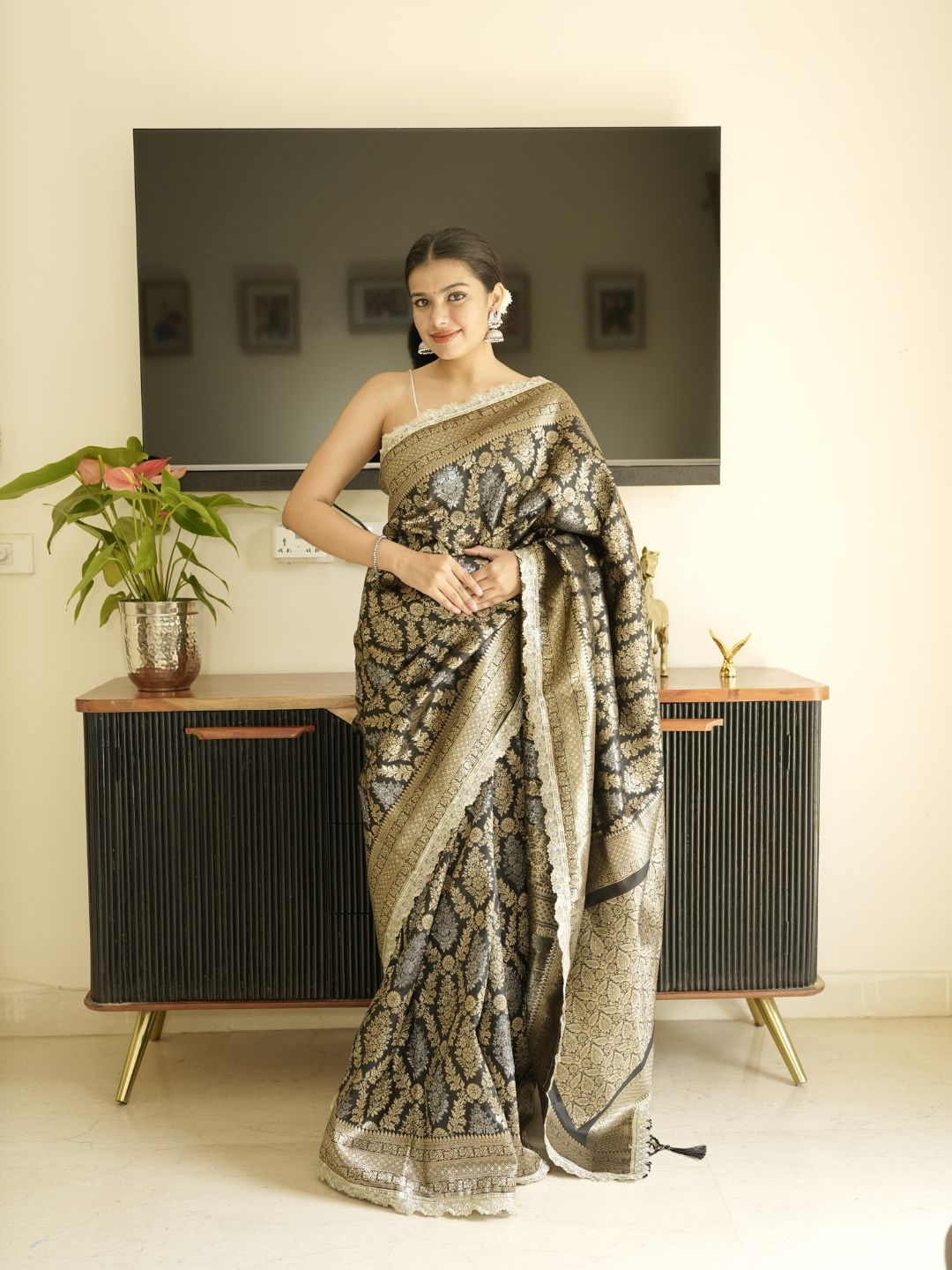 Product specialty : Drape yourself in quiet elegance with this Banarasi Saree. Lightweight and breathable, this saree is perfect for festive events, intimate gatherings, or artistic celebrations. A perfect blend of simplicity and storytelling.