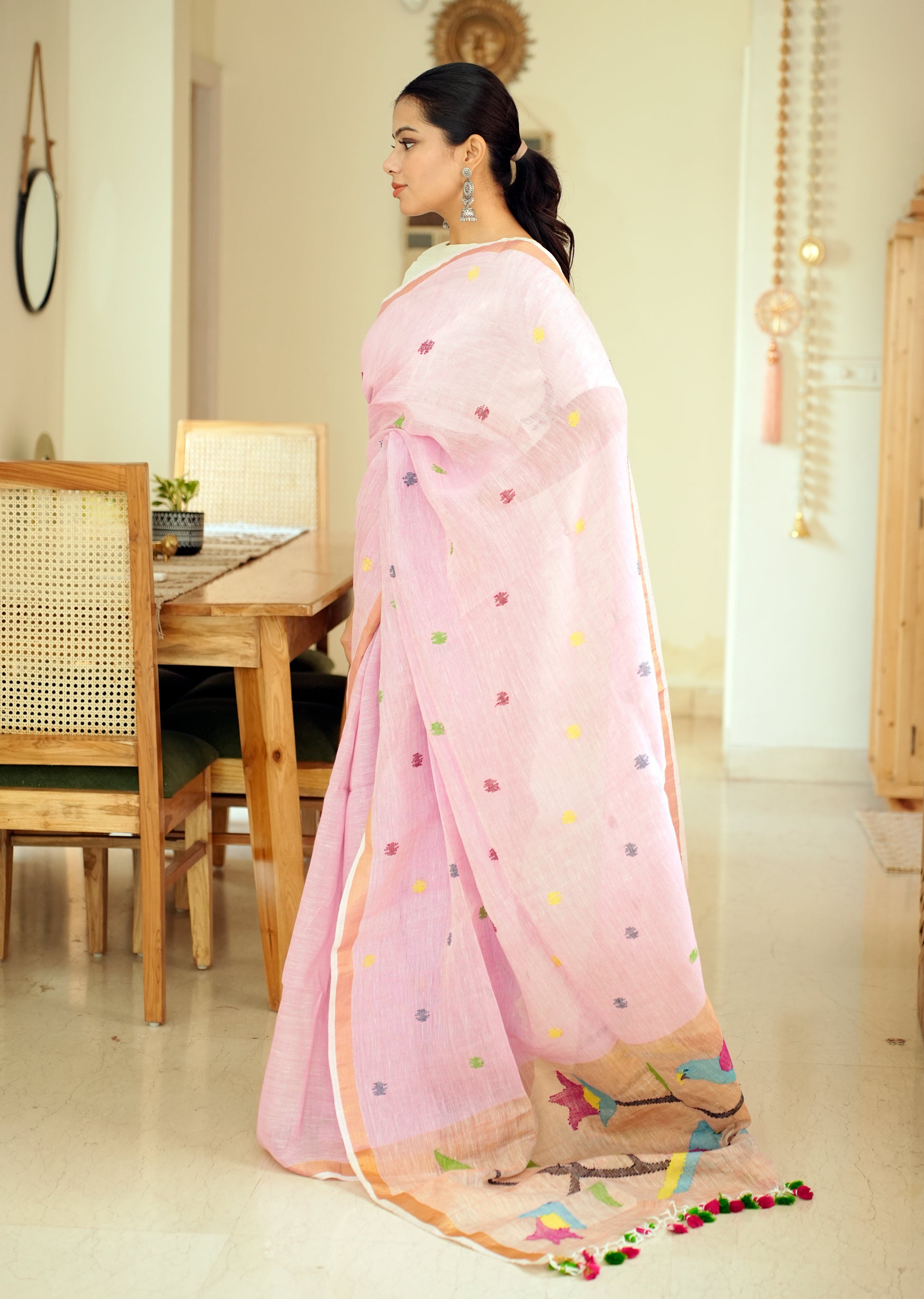 Product specialty : A delicate blend of charm and craftsmanship, this blush pink linen saree features handpainted Pichwai-inspired motifs of birds perched gracefully on branches. Accentuated with vibrant woven butis across the body and finished with a soft golden border, this saree radiates quiet sophistication and joy. Lightweight and breathable, it's perfect for summer festivities, casual celebrations, or a serene day out. Pair it with silver jewellery and a pastel blouse for an effortlessly graceful look.