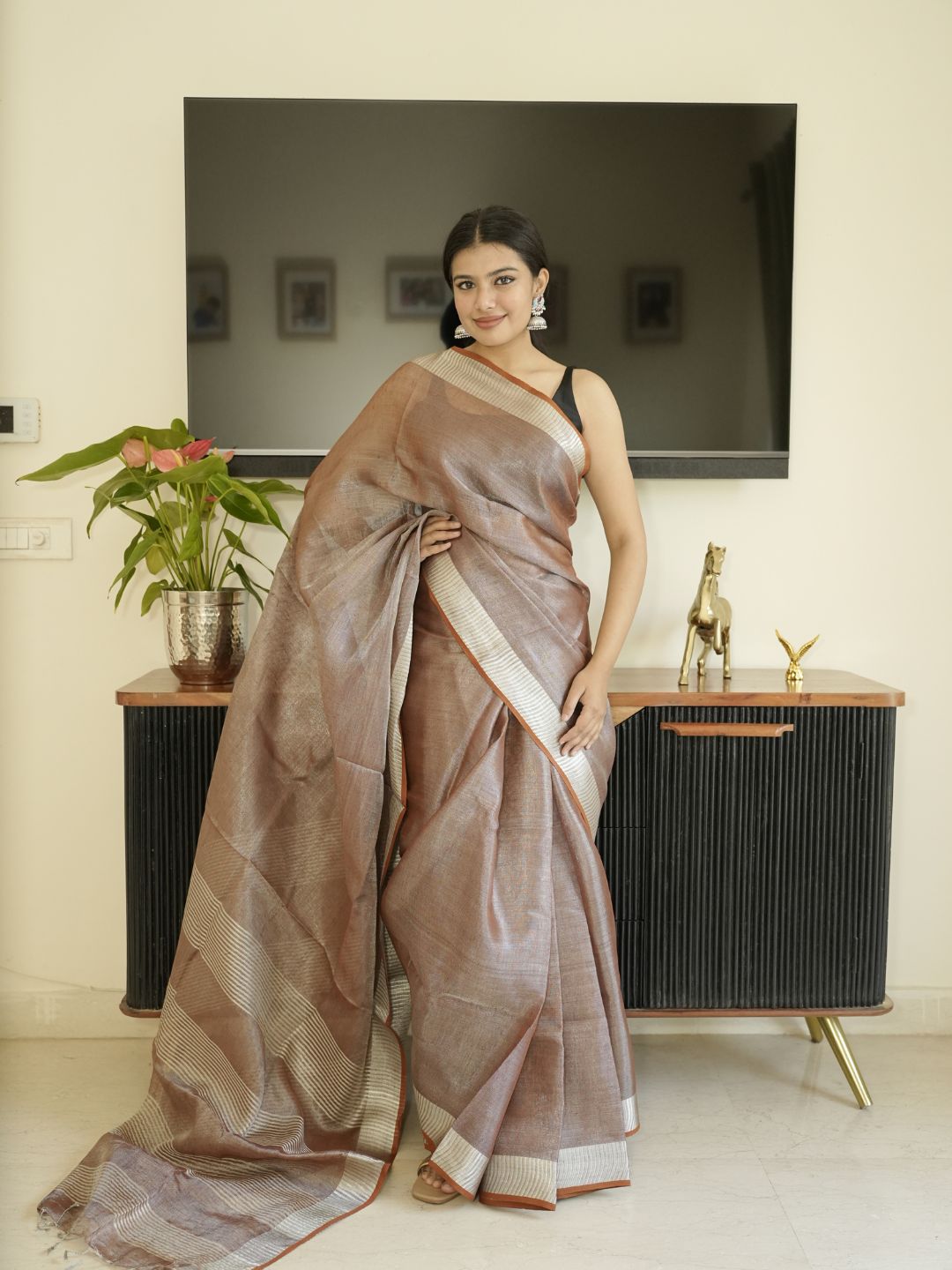 Chocolate Brown Tissue Linen Saree With Zari Border
