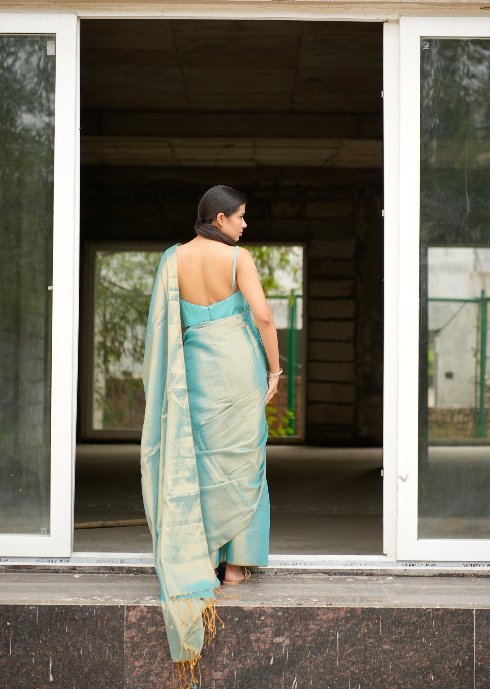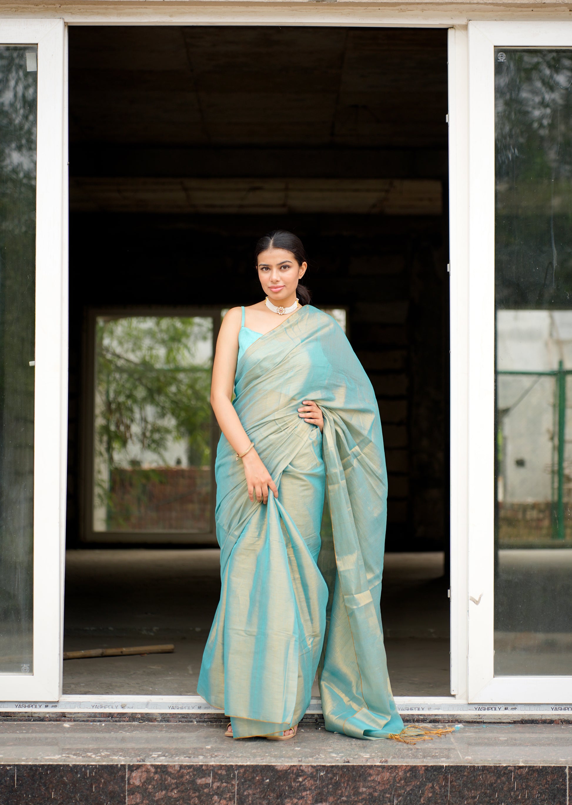Dual Tone Blue & Gold Handwoven Tissue Saree