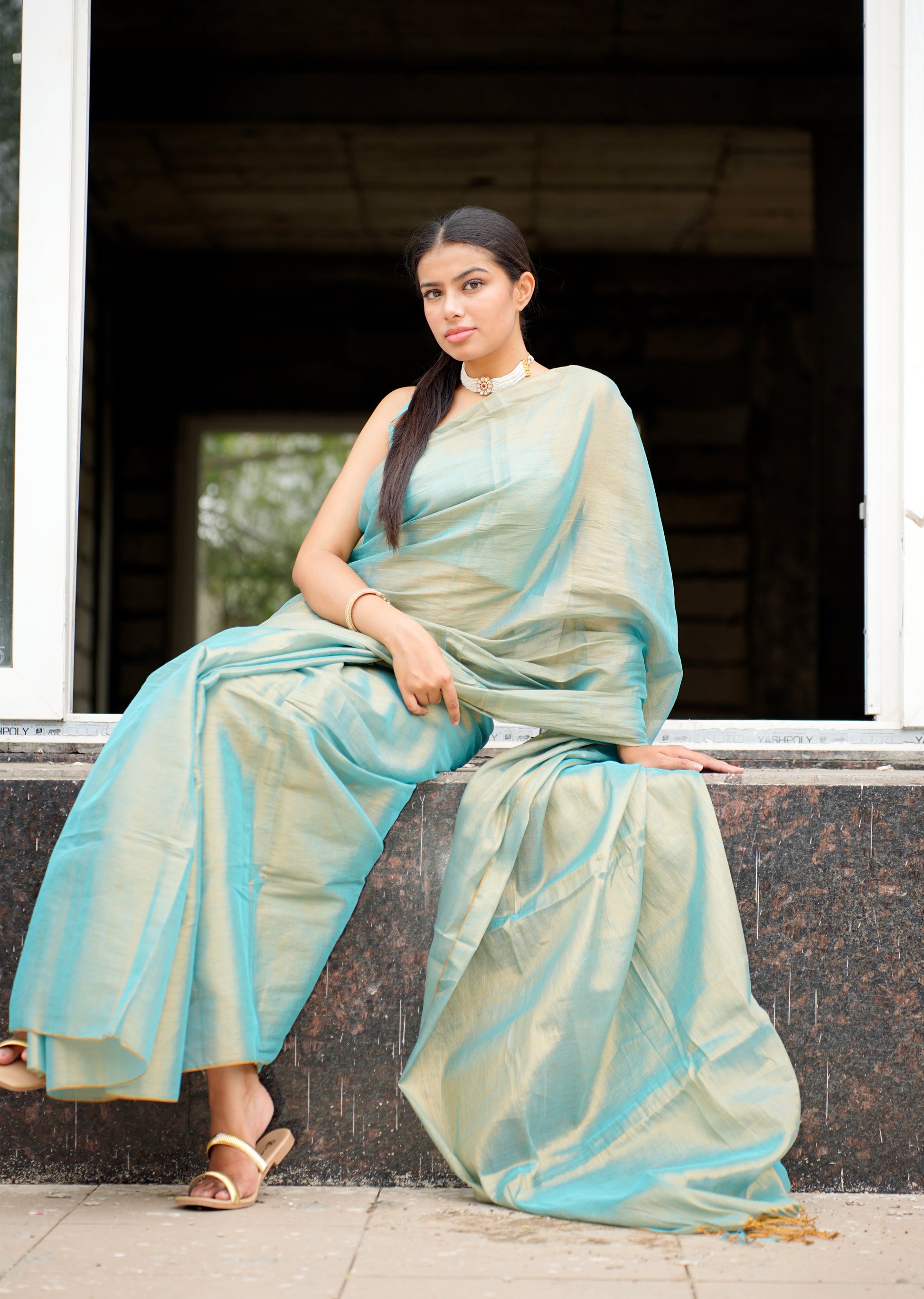 Product specialty : Ethereal and elegant, the Dual Tone Blue & Gold Handwoven Cotton Saree is a whisper of understated grace. Woven in a soothing shade of pale aqua with subtle beige undertones, this saree is perfect for those who prefer a calm and refined aesthetic. The airy cotton fabric drapes effortlessly, offering comfort with every fold. Paired here with a matching blouse and minimal jewelry, this look is ideal for intimate gatherings, cultural outings, or serene daywear.