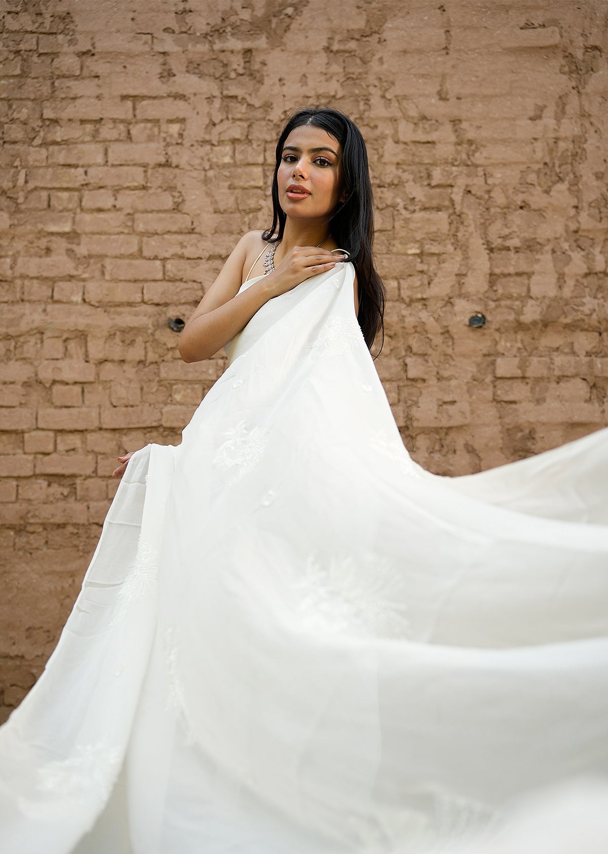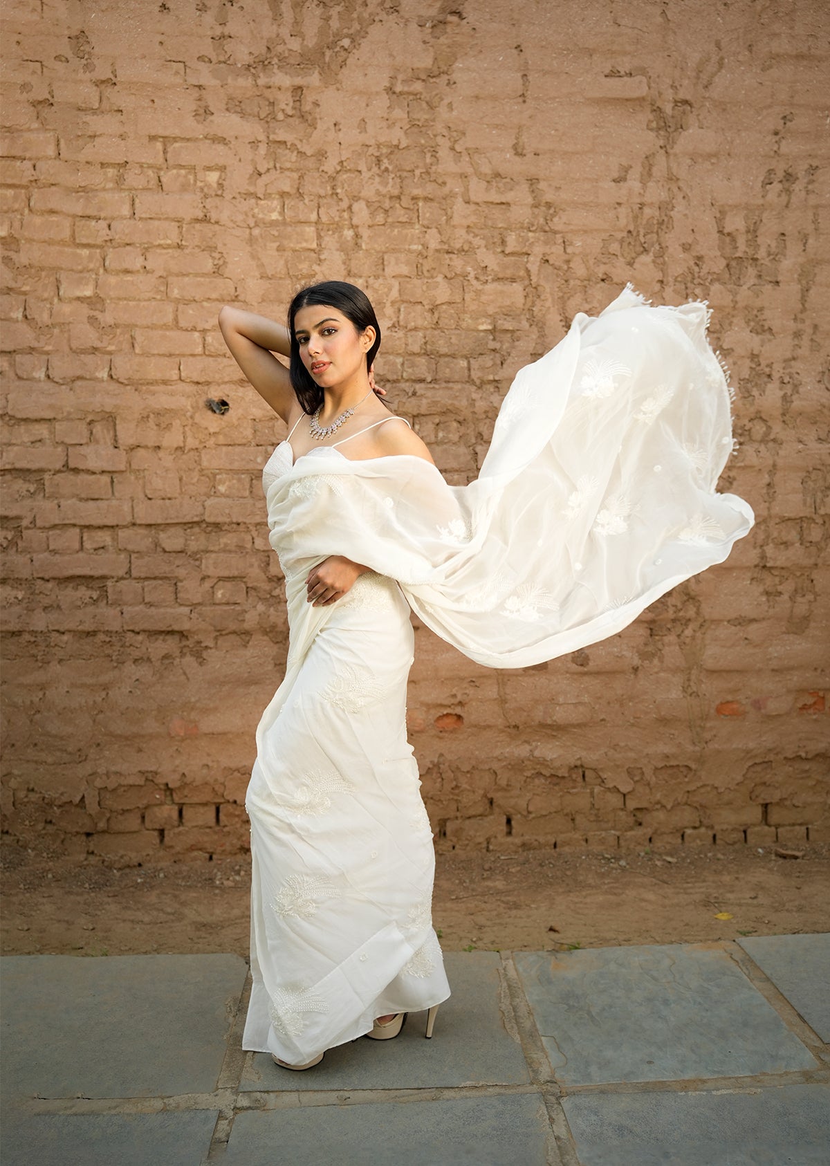 Pair it with a vibrant embroidered lehenga or a rich silk saree in jewel tones. Add chandelier earrings, a statement choker, and metallic heels for a complete festive look. Finish with soft waves or a sleek bun and a shimmering clutch for ultimate elegance.