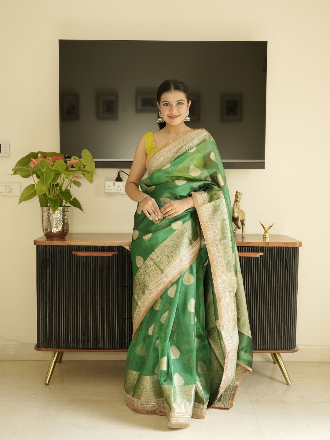 Product specialty : Drape yourself in quiet elegance with this Banarasi Saree. Lightweight and breathable, this saree is perfect for festive events, intimate gatherings, or artistic celebrations. A perfect blend of simplicity and storytelling.