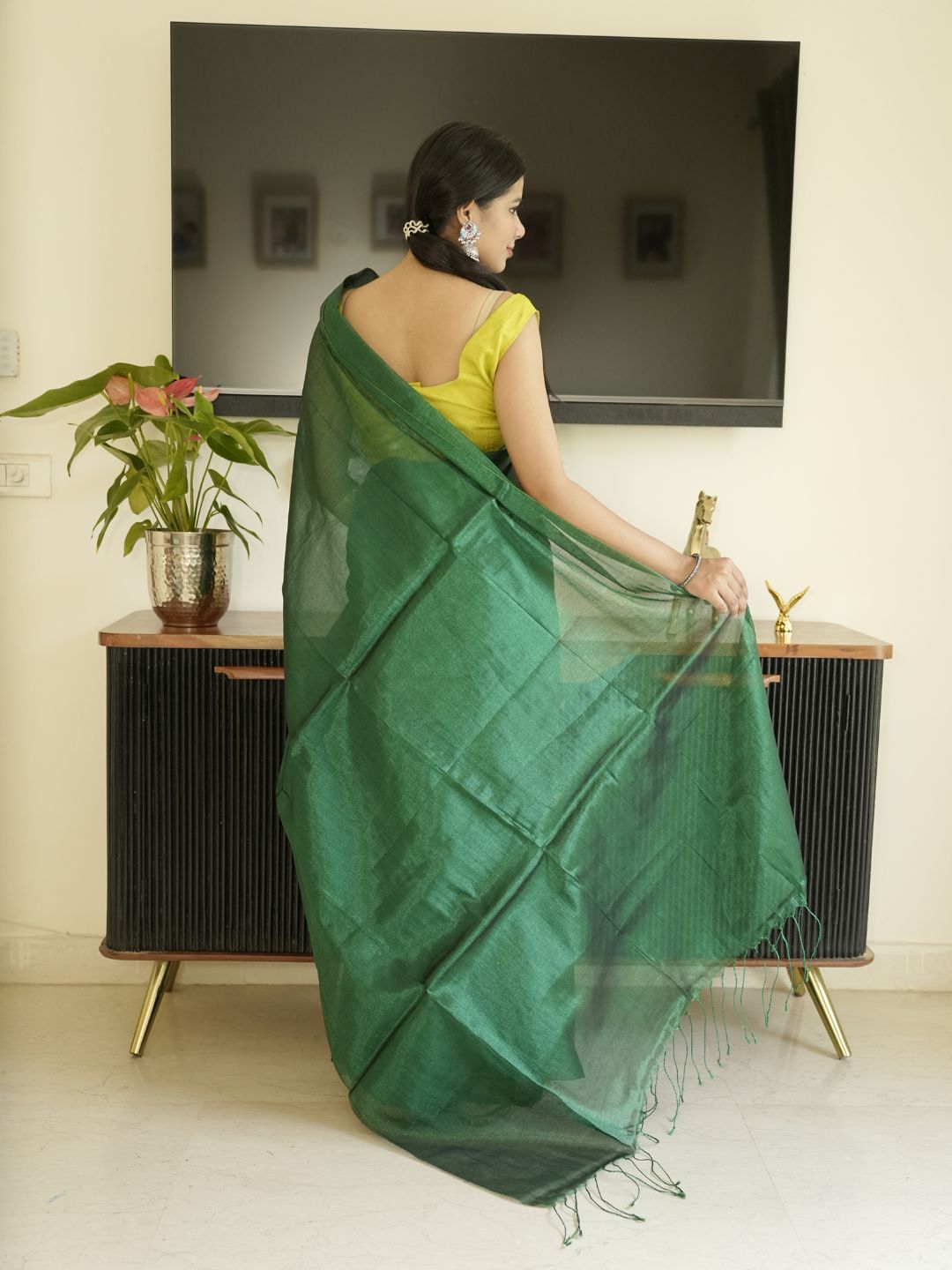 To ensure a sleek and polished look with this modern saree, choose a fitted, lightweight petticoat in a neutral tone of Green, which won’t distract from the saree’s vibrancy. The saree should be draped with crisp pleats at the waist, and the pallu should fall gracefully over the shoulder, with minimal pinning to allow the fabric to flow naturally. A form-fitting blouse, preferably with a modern cut like a halter or keyhole neckline, will keep the look streamlined and stylish.