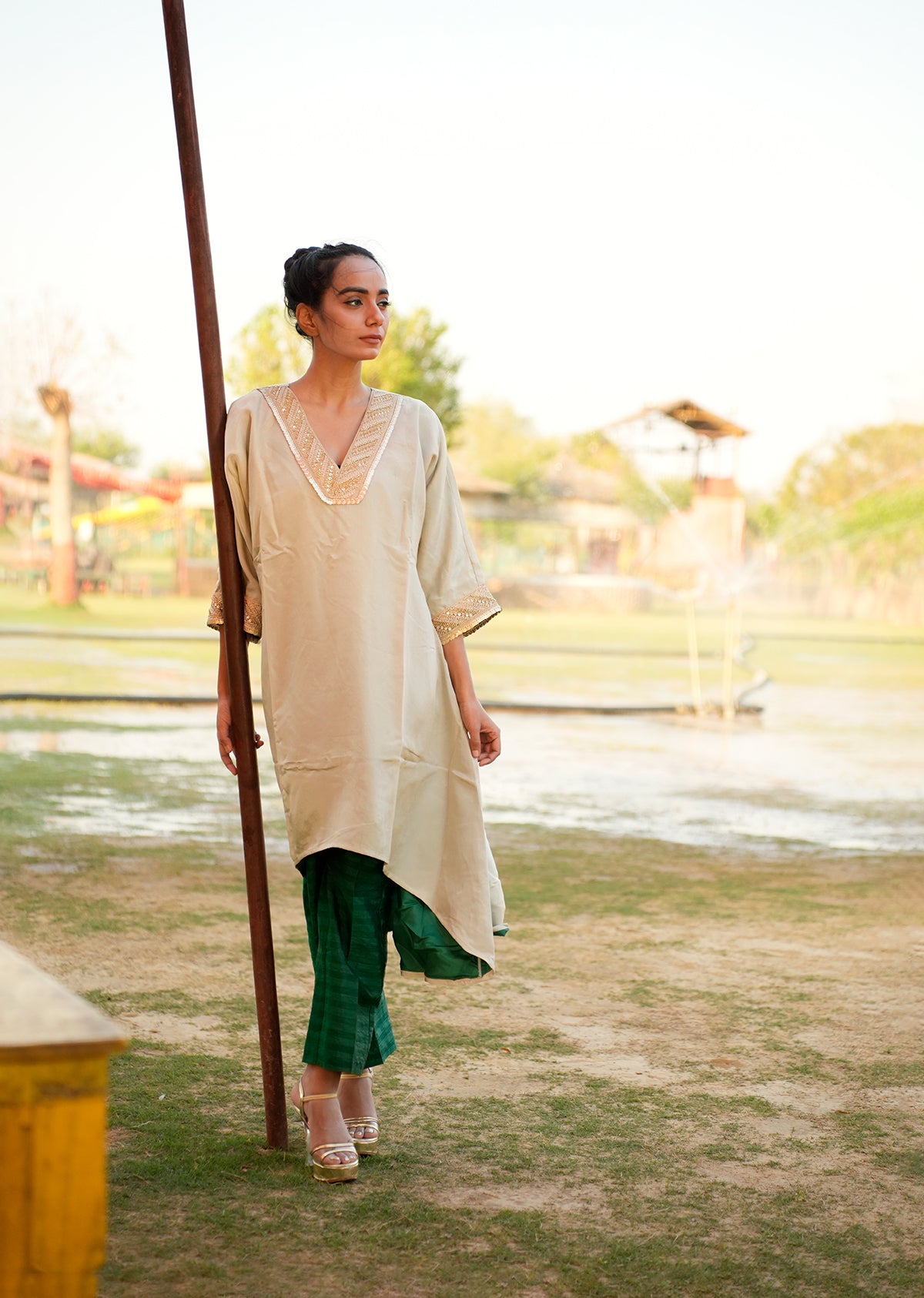 Product specialty : Step into effortless charm with the Green Kaftan Set with Pants Breezy Elegance by Uttarraa Fashions Pvt Ltd. This graceful ensemble features a luxurious, soft-flowing kaftan with intricate sequin and thread embroidery along the neckline and cuffs. Paired with structured green silk pants, this set is designed to bring comfort and sophistication together. Perfect for intimate gatherings, festive celebrations, or stylish brunches, it radiates understated glamour with every step.