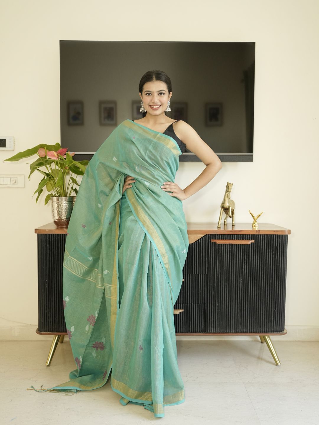 Product specialty : Drape yourself in quiet elegance with this Linen Silk Saree. Lightweight and breathable, this saree is perfect for festive events, intimate gatherings, or artistic celebrations. A perfect blend of simplicity and storytelling.