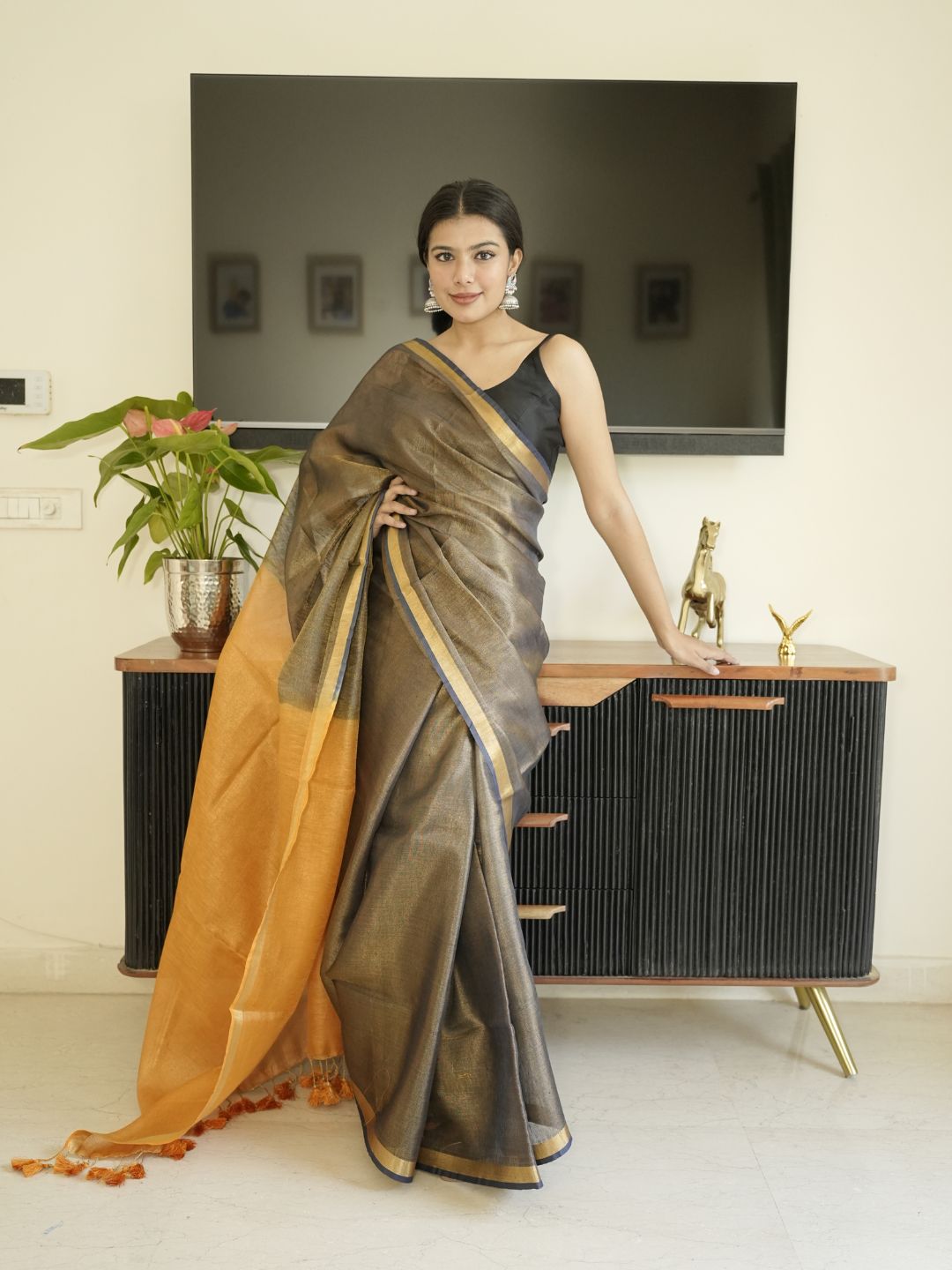 Grey Tissue Linen Saree With Golden Zari Pallu