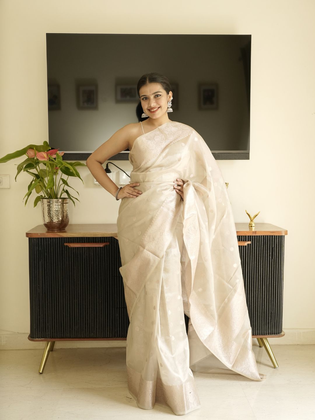 To ensure a sleek and polished look with this modern saree, choose a fitted, lightweight petticoat in a neutral tone of Ivory, which won’t distract from the saree’s vibrancy. The saree should be draped with crisp pleats at the waist, and the pallu should fall gracefully over the shoulder, with minimal pinning to allow the fabric to flow naturally. A form-fitting blouse, preferably with a modern cut like a halter or keyhole neckline, will keep the look streamlined and stylish.
