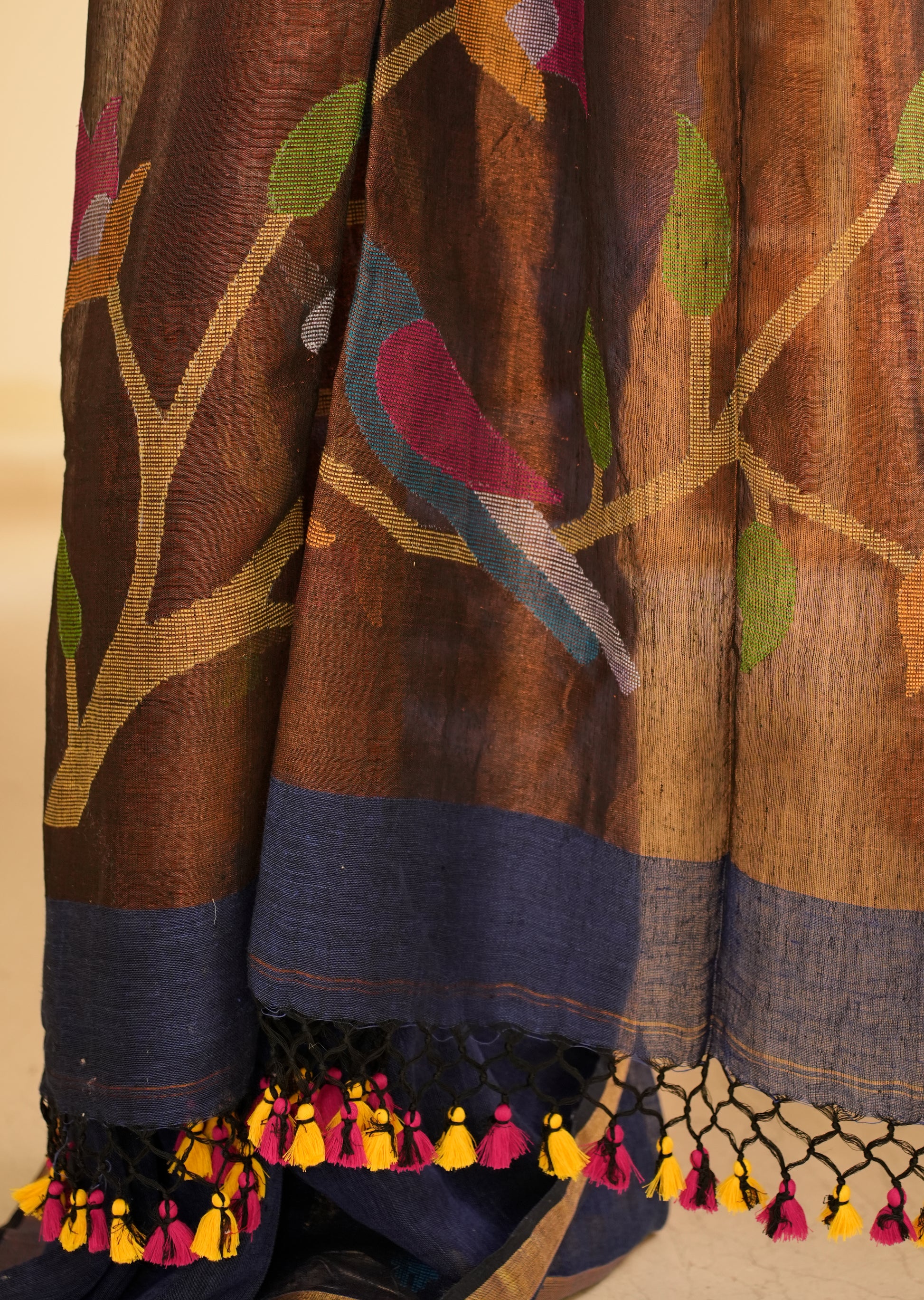 Product specialty : Drape yourself in quiet elegance with this Midnight Blue Linen Saree featuring a delicately handpainted pallu inspired by nature—birds resting on branches, painted with earthy grace. The subtle zari border adds a refined shimmer, while multicolour woven motifs lend it a touch of playful charm. Lightweight and breathable, this saree is perfect for day events, intimate gatherings, or artistic celebrations. A perfect blend of simplicity and storytelling.