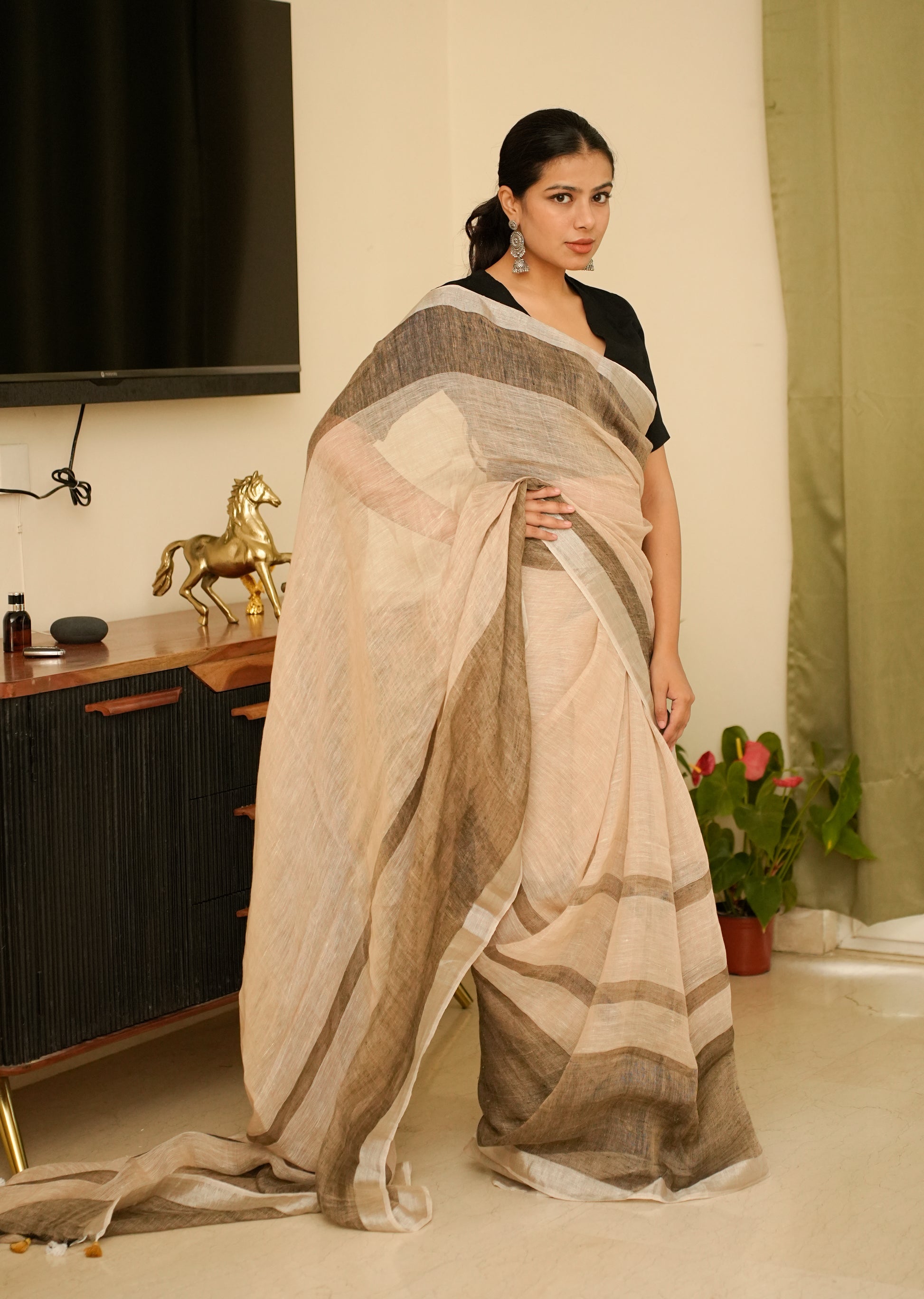 Minimalist Chic - Beige Linen Saree with Subtle Grey Stripes