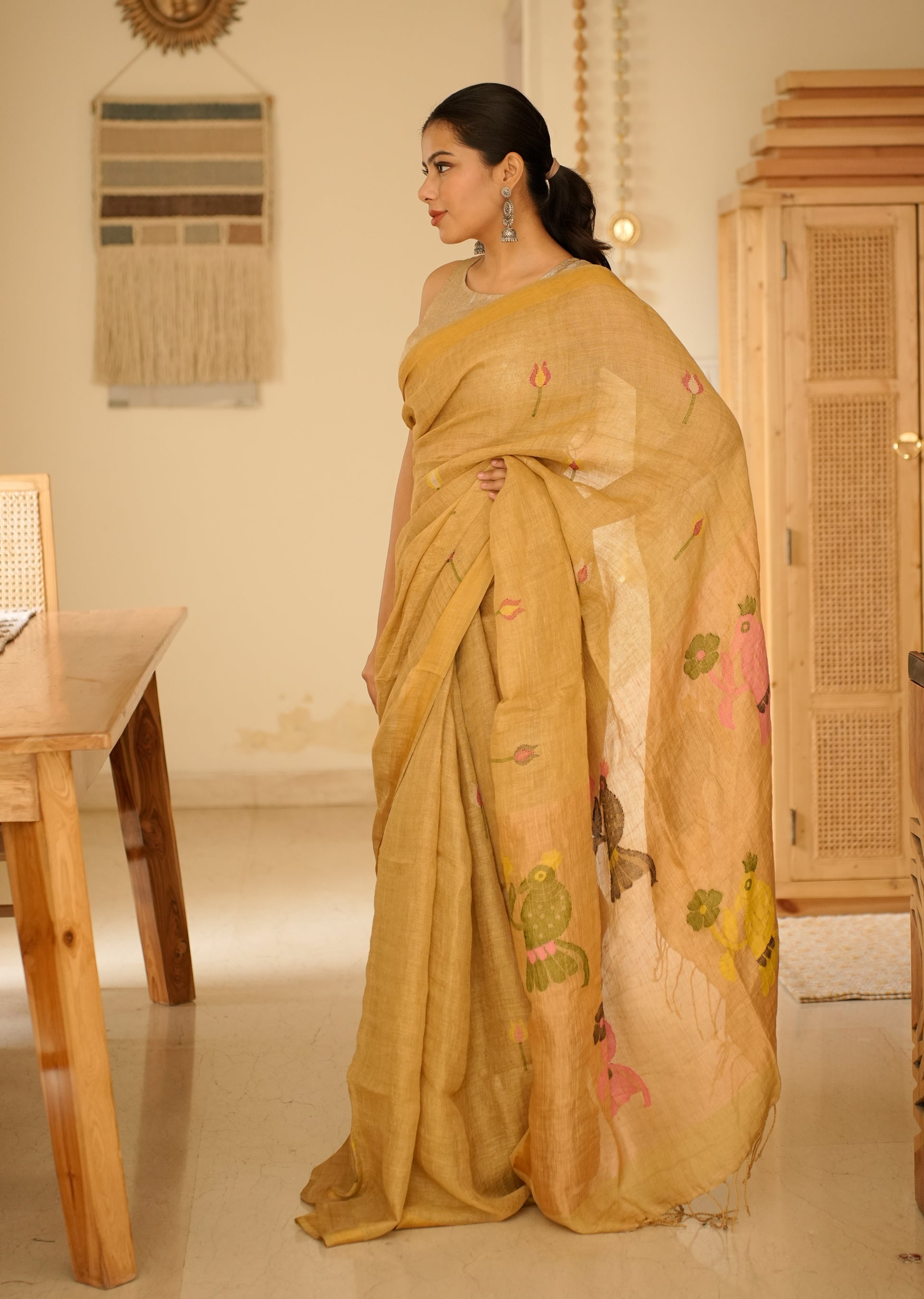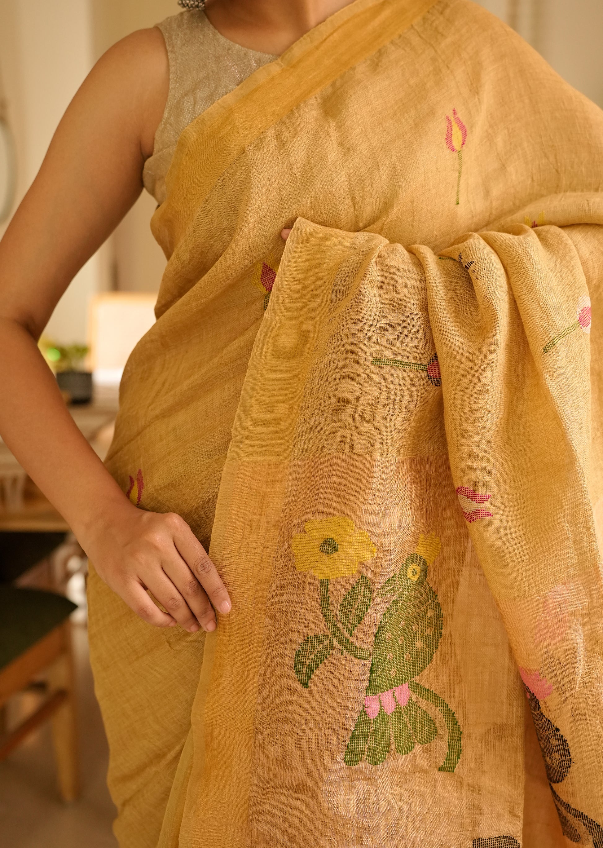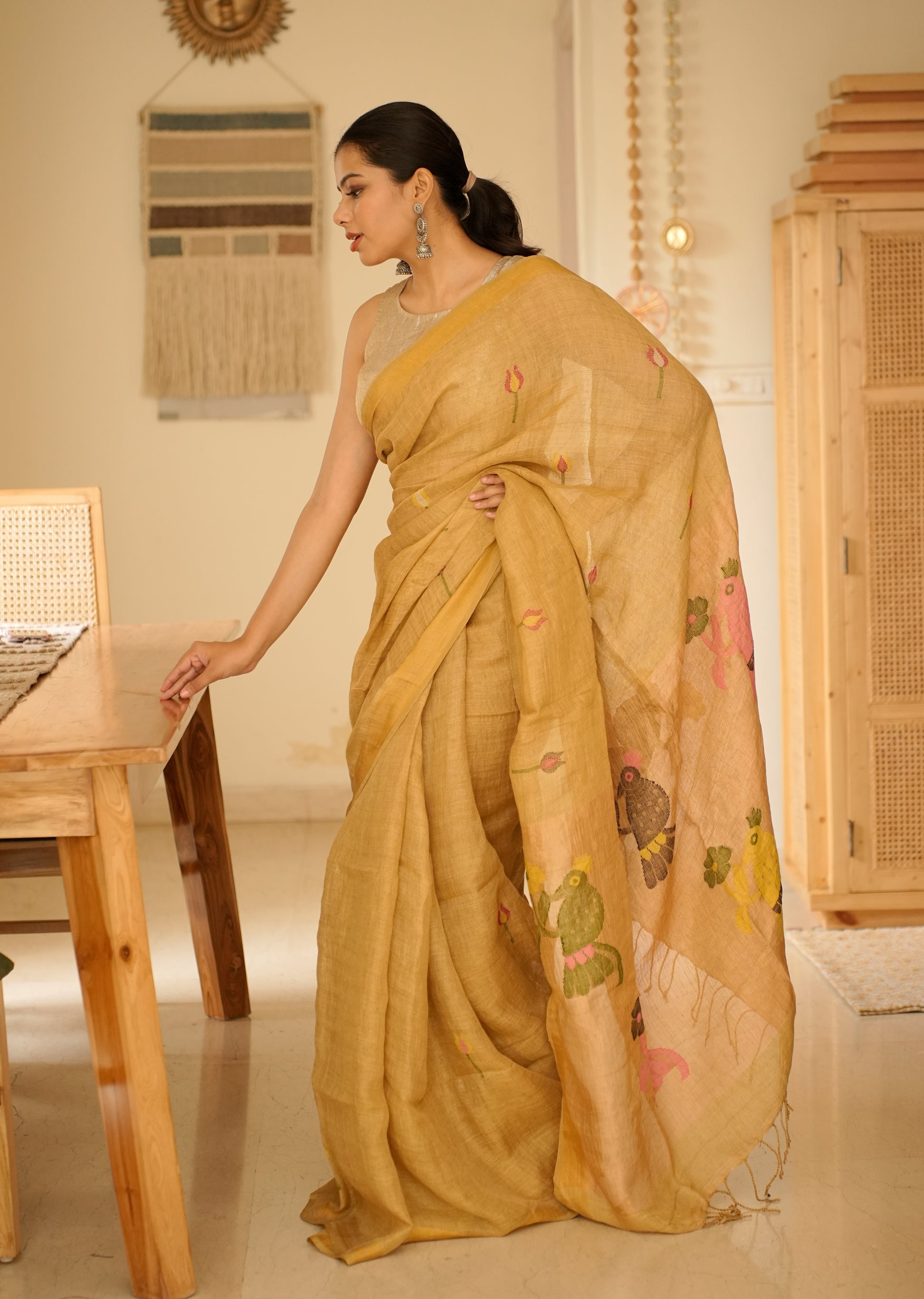 Handwoven Blue Linen Saree with Tassel & Hand Embroidery