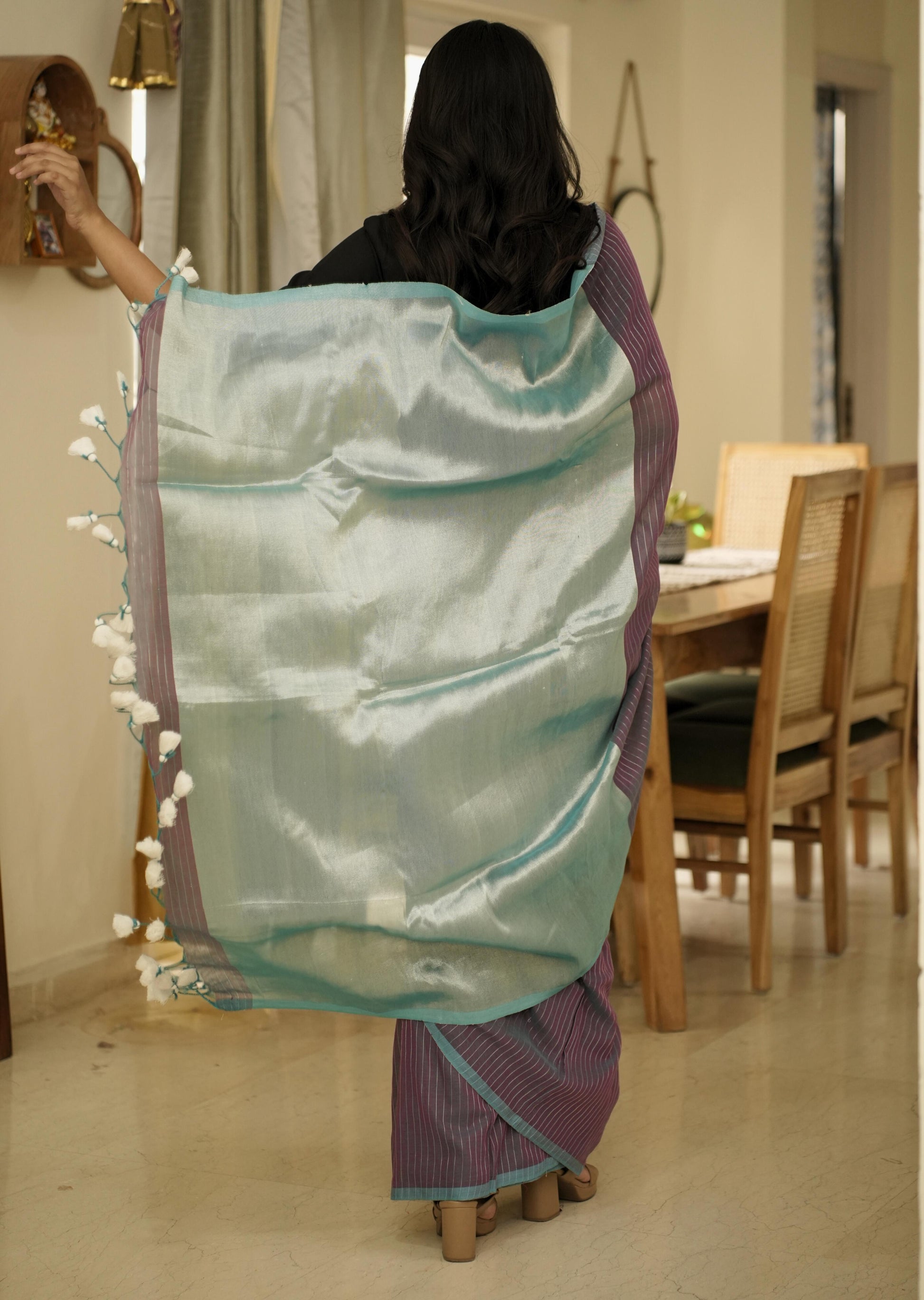 Neelakshi – Handwoven Purple & Teal Striped Mul Cotton Saree with Shimmer Pallu