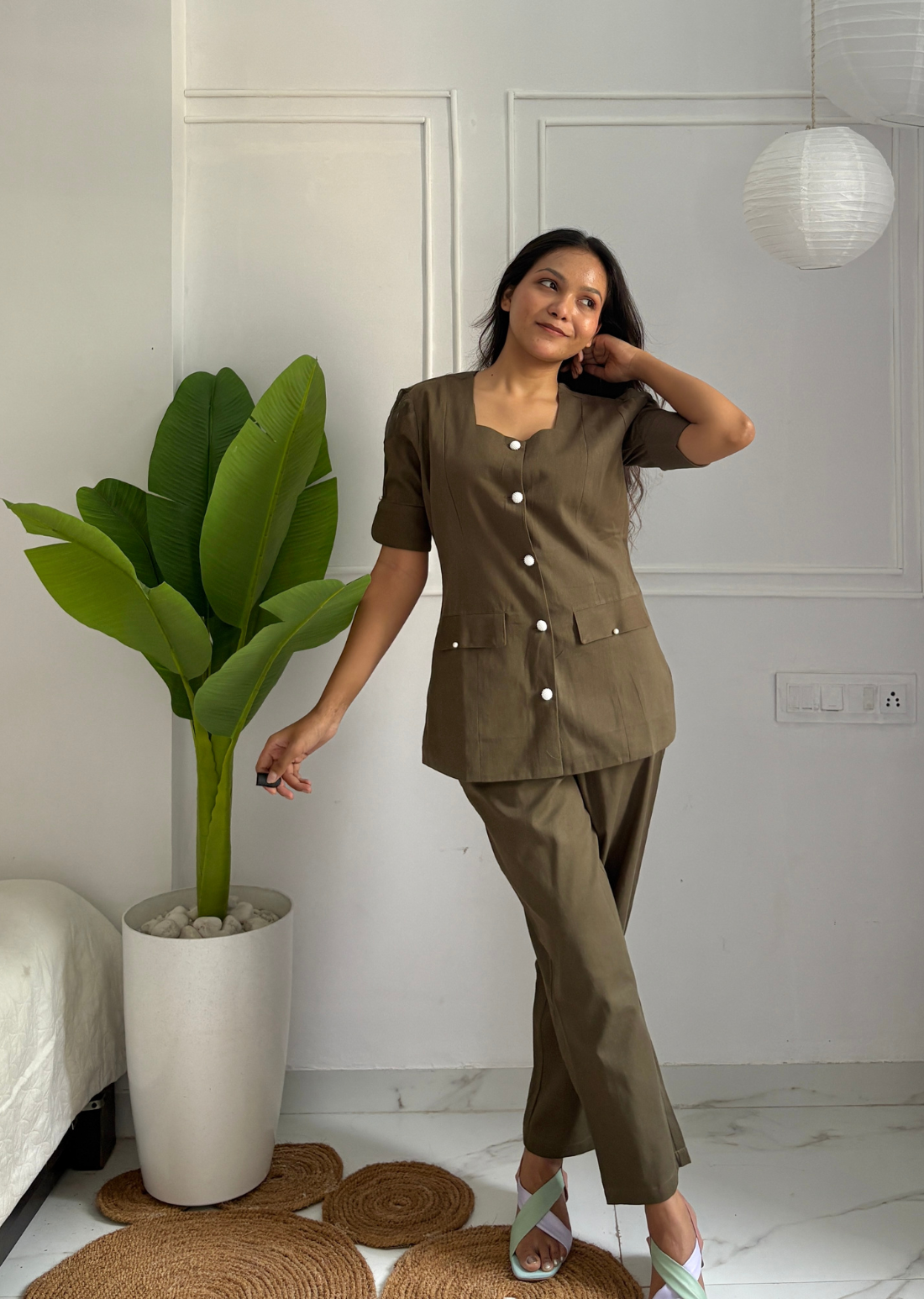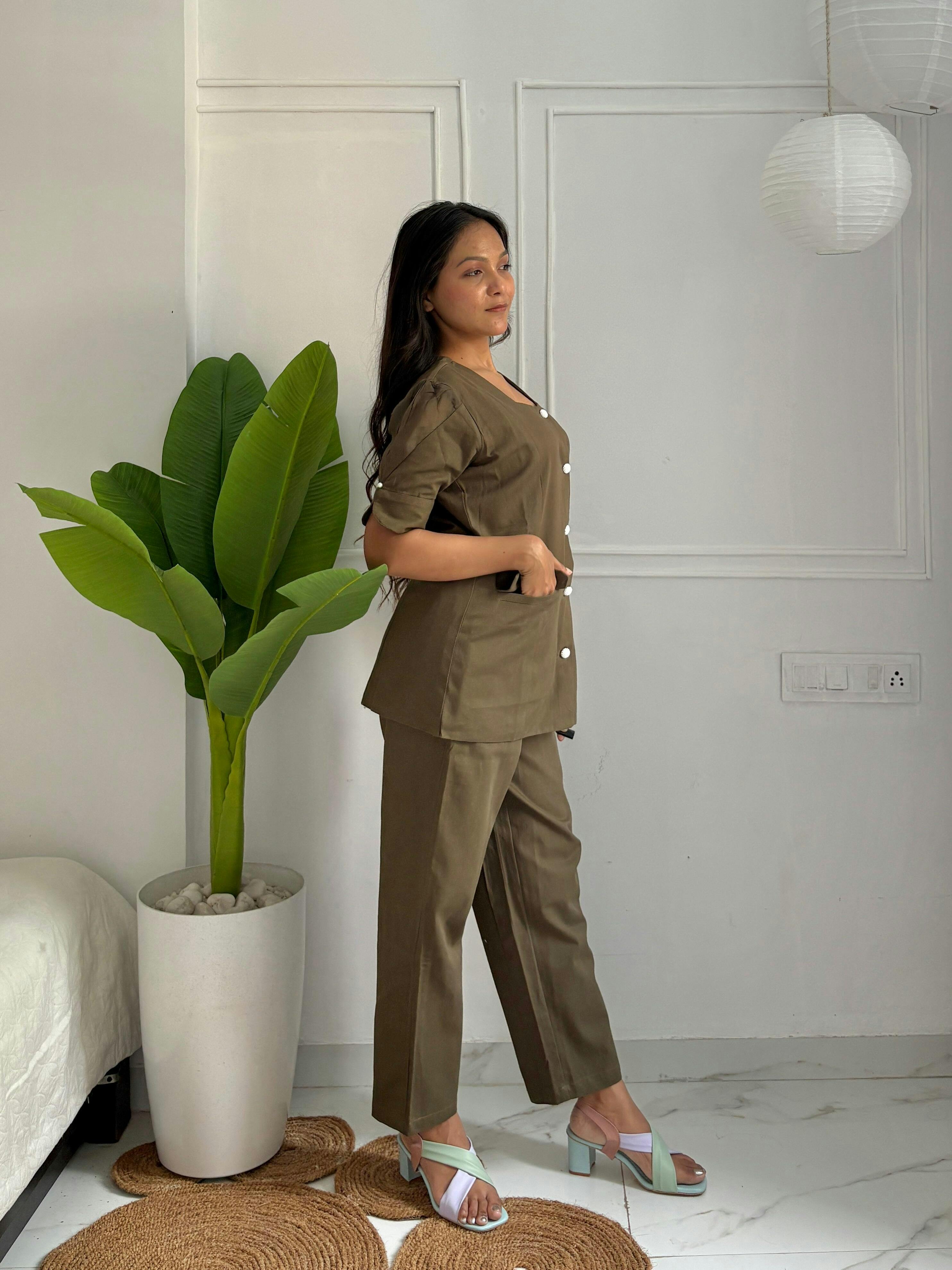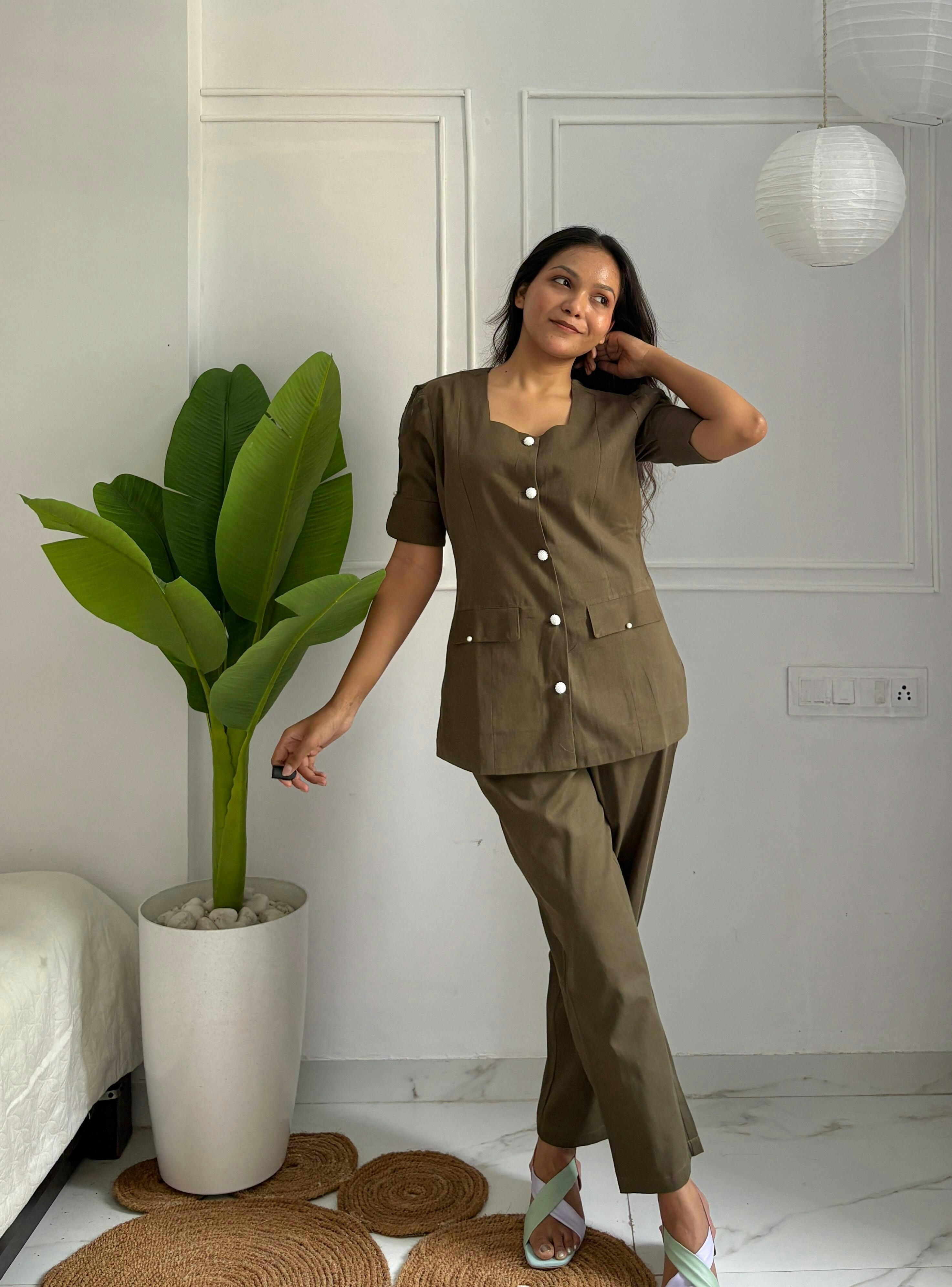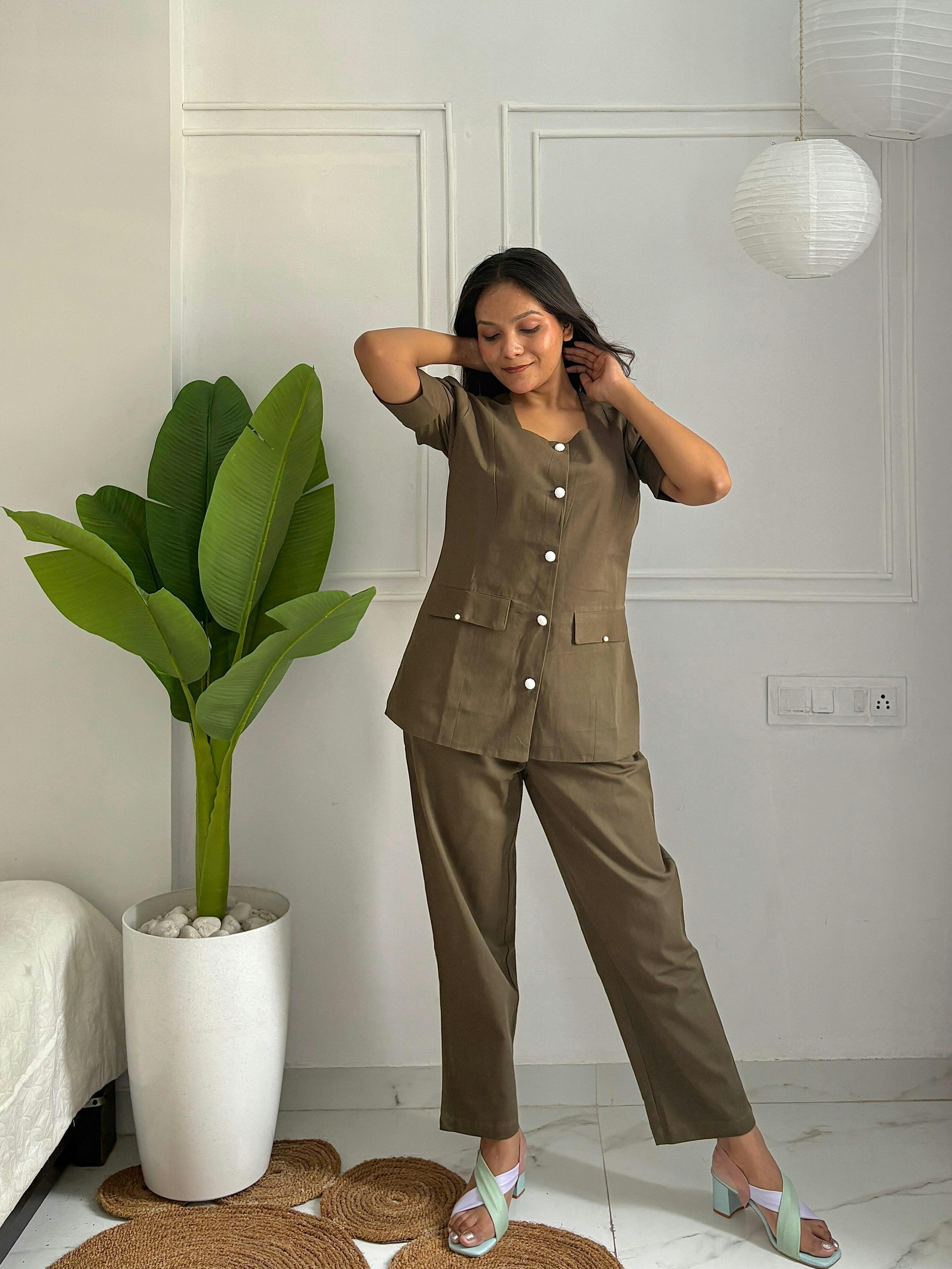 Product Specialty : Step into effortless elegance with the Olive Green Co-Ords from Uttarraa Fashions Pvt. Ltd. Designed to exude sophistication and contemporary charm, this ensemble features a beautifully tailored co-ord set in a rich olive green hue. The top showcases Button Embellishment, adding a touch of grace, while the complementing bottoms ensure a flawless, streamlined silhouette. Crafted with attention to detail and premium fabrics, this set is perfect for any occasion where style and comfort go hand in hand. Recognized as the Most Trusted Brand, we bring you fashion that reflects timeless beauty—just as promised.