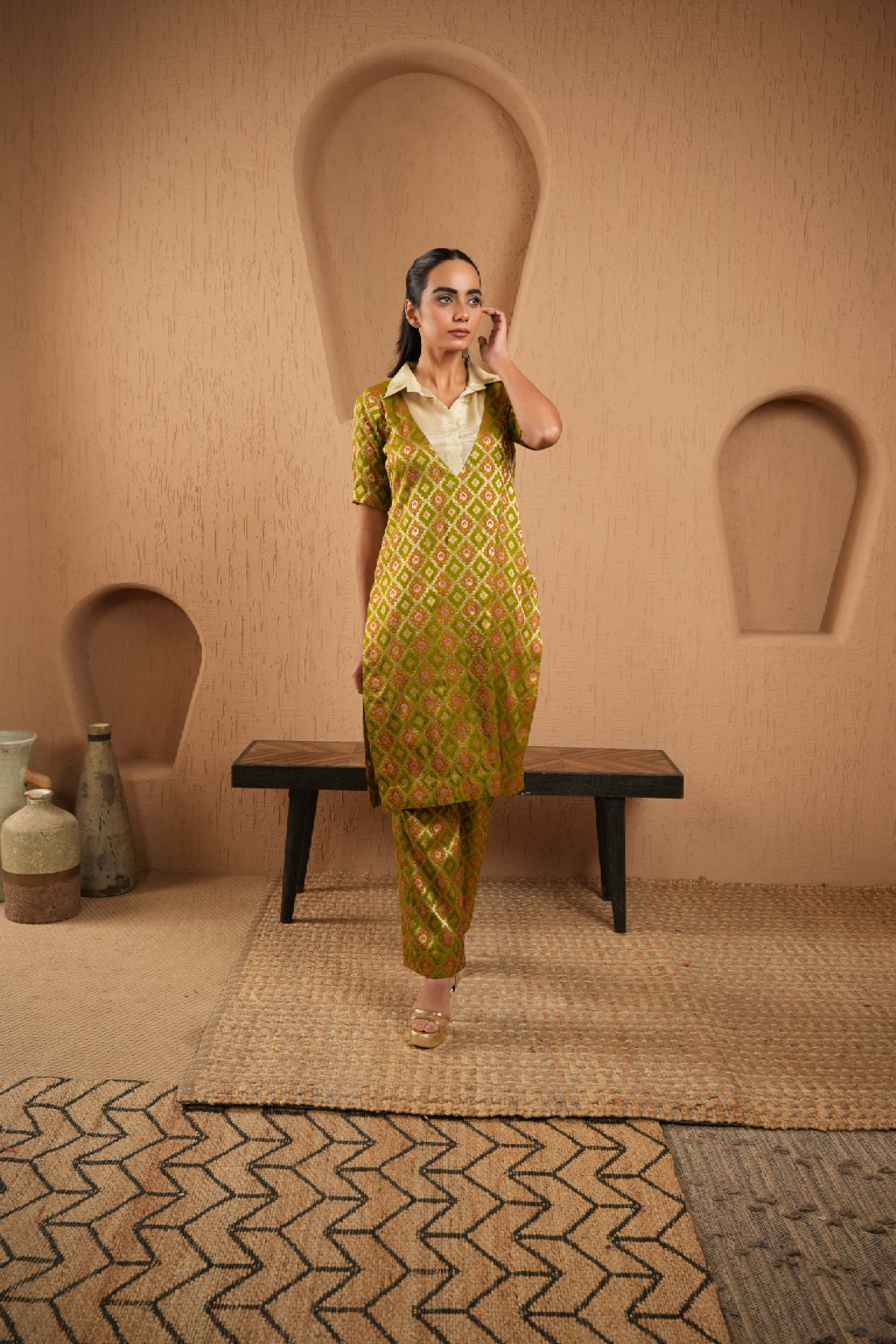 Pair this olive green set with bold jhumkas or chandbalis, metallic kolhapuris or block heels, and a chic clutch. Add soft curls or a sleek bun and light makeup for a graceful, festive-ready look.
