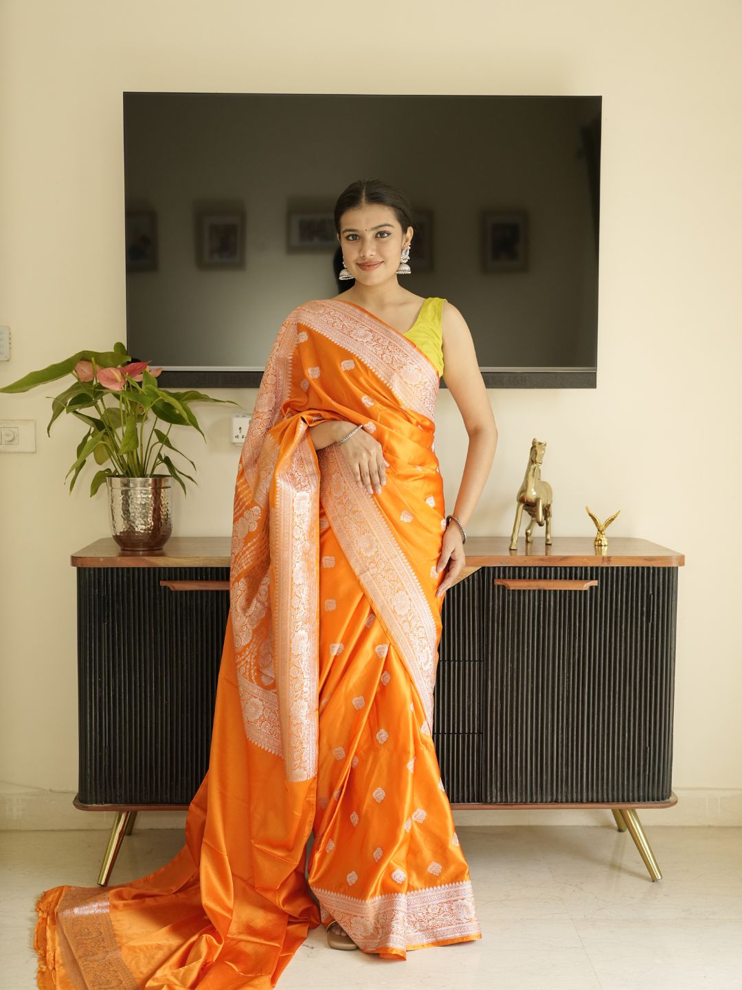 Product specialty : Drape yourself in quiet elegance with this Banarasi Saree. Lightweight and breathable, this saree is perfect for festive events, intimate gatherings, or artistic celebrations. A perfect blend of simplicity and storytelling.