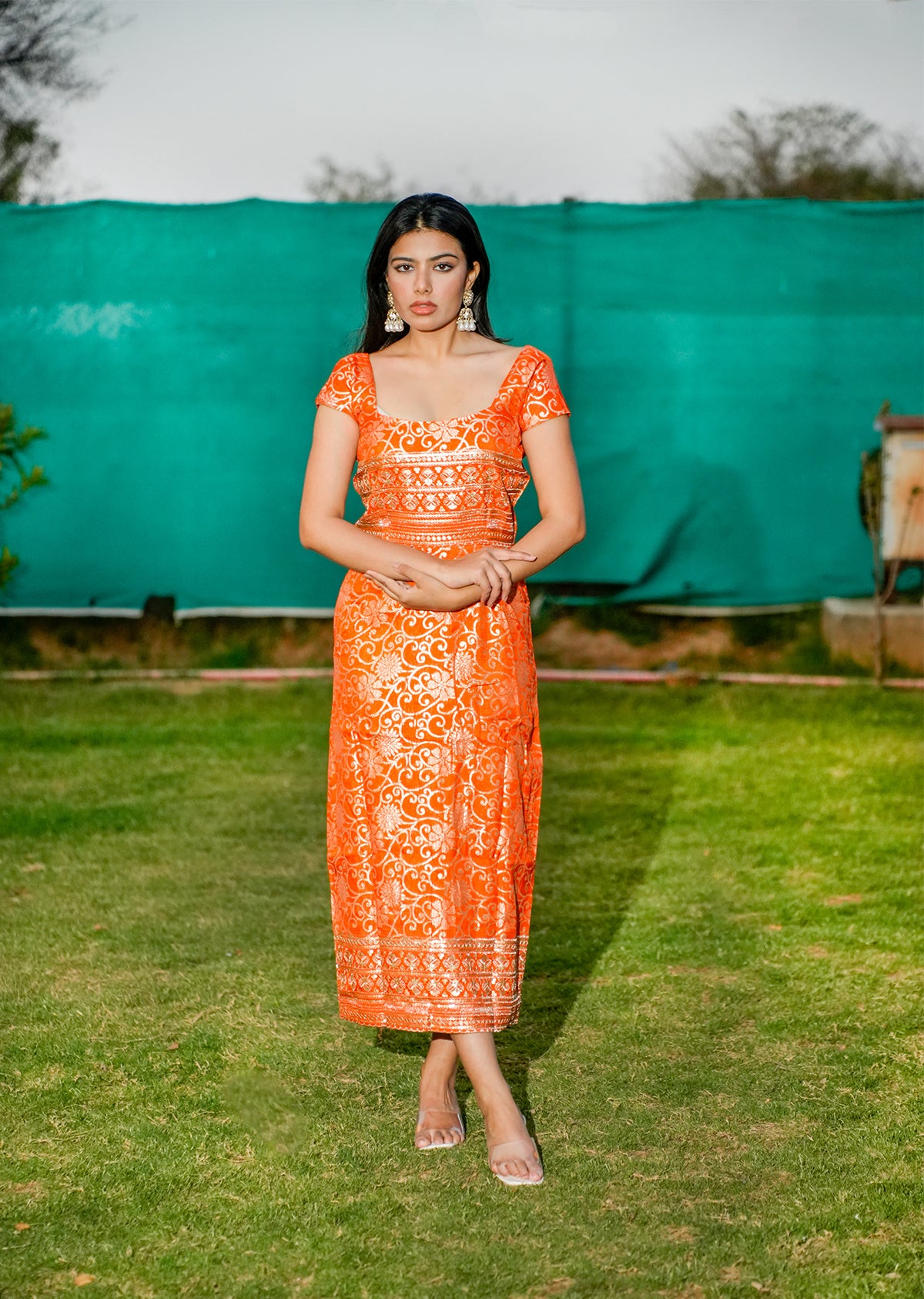 Product specialty : Step into radiant charm with our Orange Brocade A-Line Slit Dress for Statement Style by Uttarraa Fashions Pvt Ltd. Designed to make heads turn, this exquisite dress features luxurious brocade work with intricate golden patterns that shine with elegance and tradition. The flattering A-line silhouette paired with a stylish side slit adds a modern edge, making it perfect for festive occasions and glamorous evenings alike. The square neckline beautifully frames the collarbone, while the short sleeves add a touch of grace and comfort.