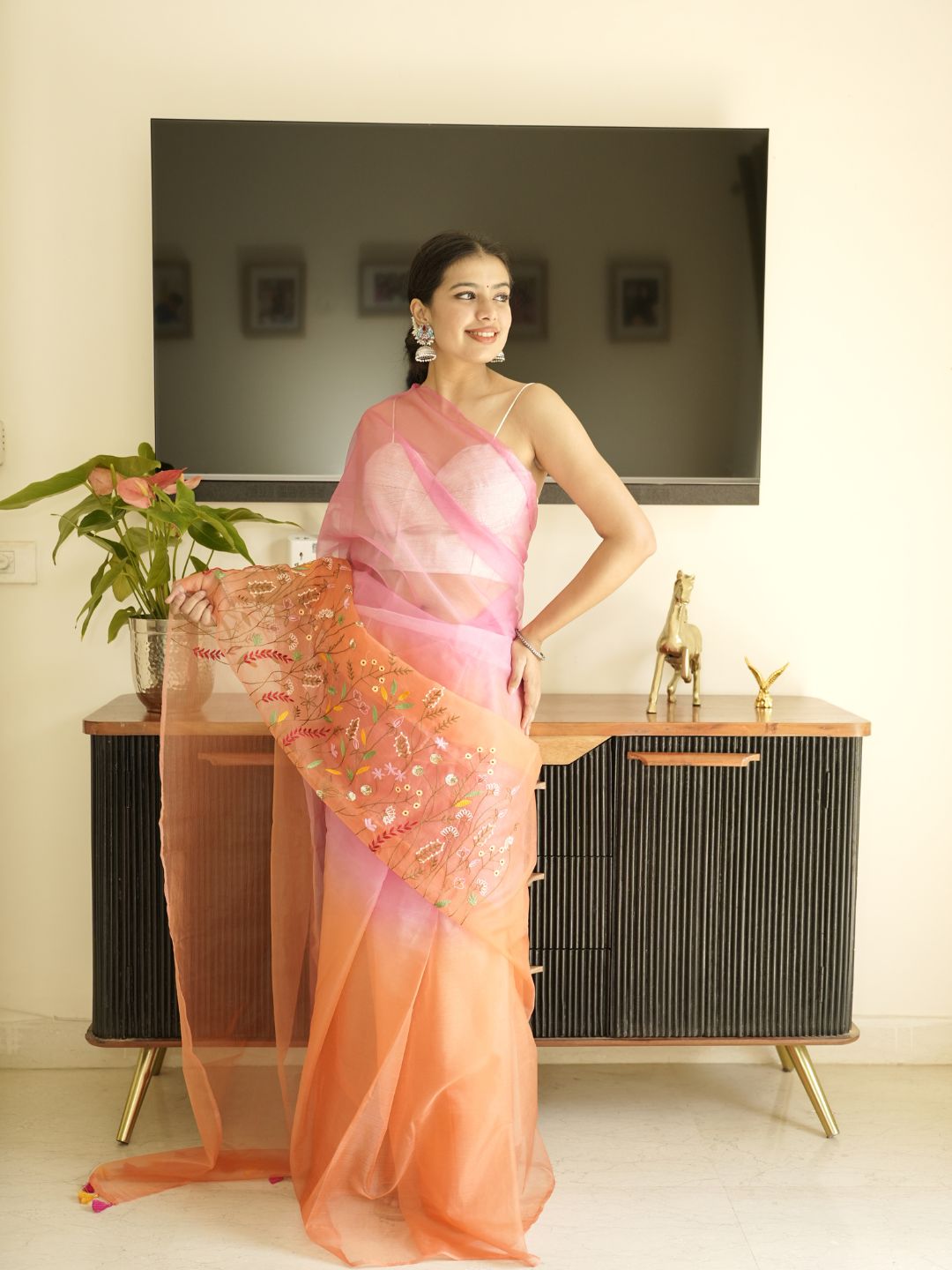 Orange-Pink Ombre Organza Saree With Hand Embroidery