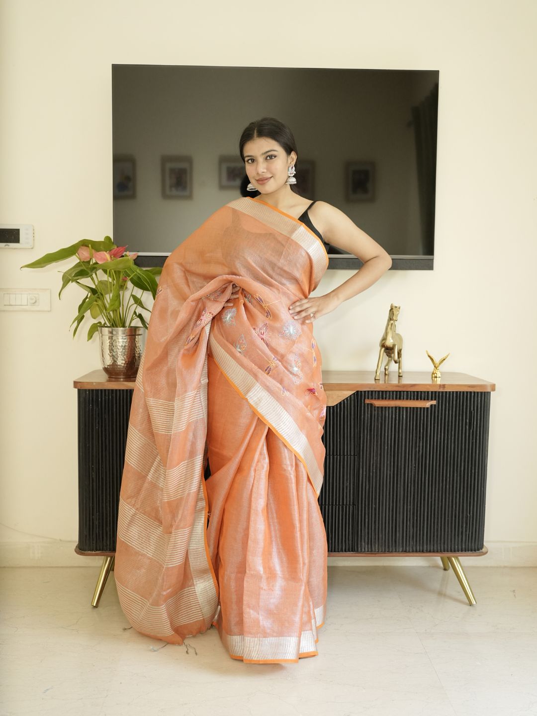 Product specialty : Drape yourself in quiet elegance with this Tissue Linen Saree. Lightweight and breathable, this saree is perfect for festive events, intimate gatherings, or artistic celebrations. A perfect blend of simplicity and storytelling.