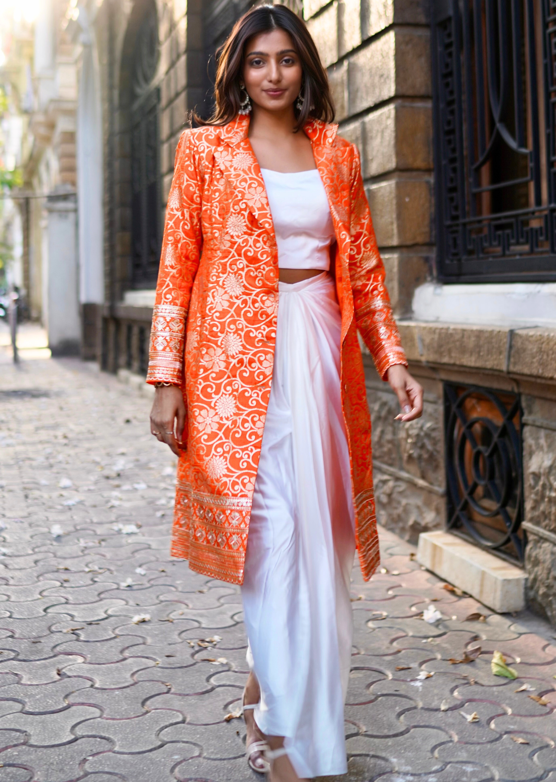 Orange & White Brocade Ensemble – Draped Skirt & Coat