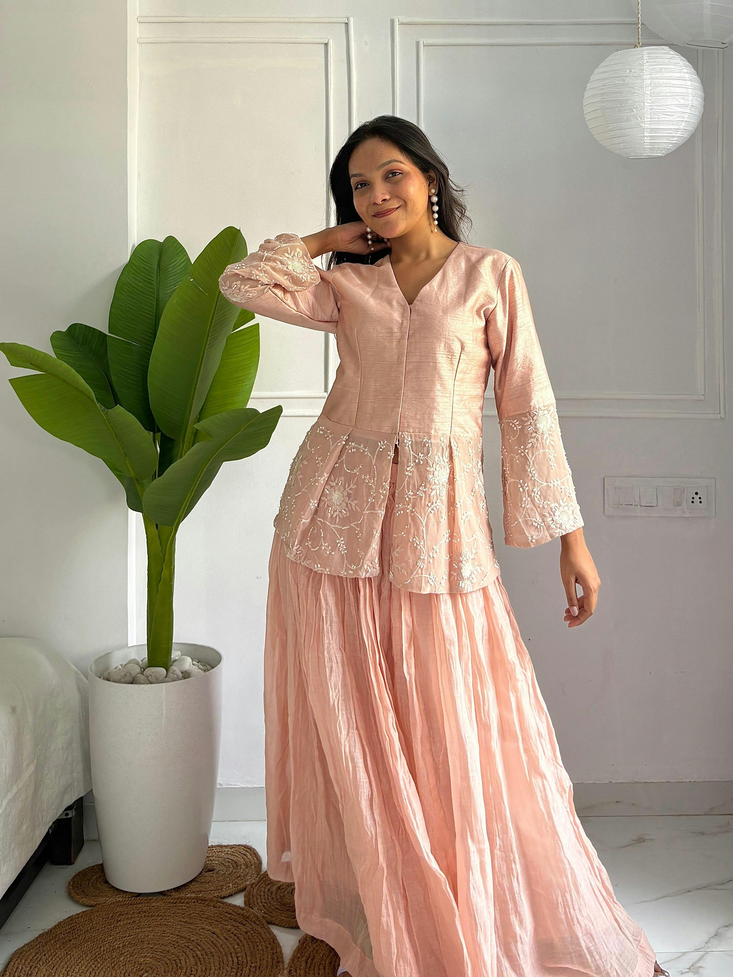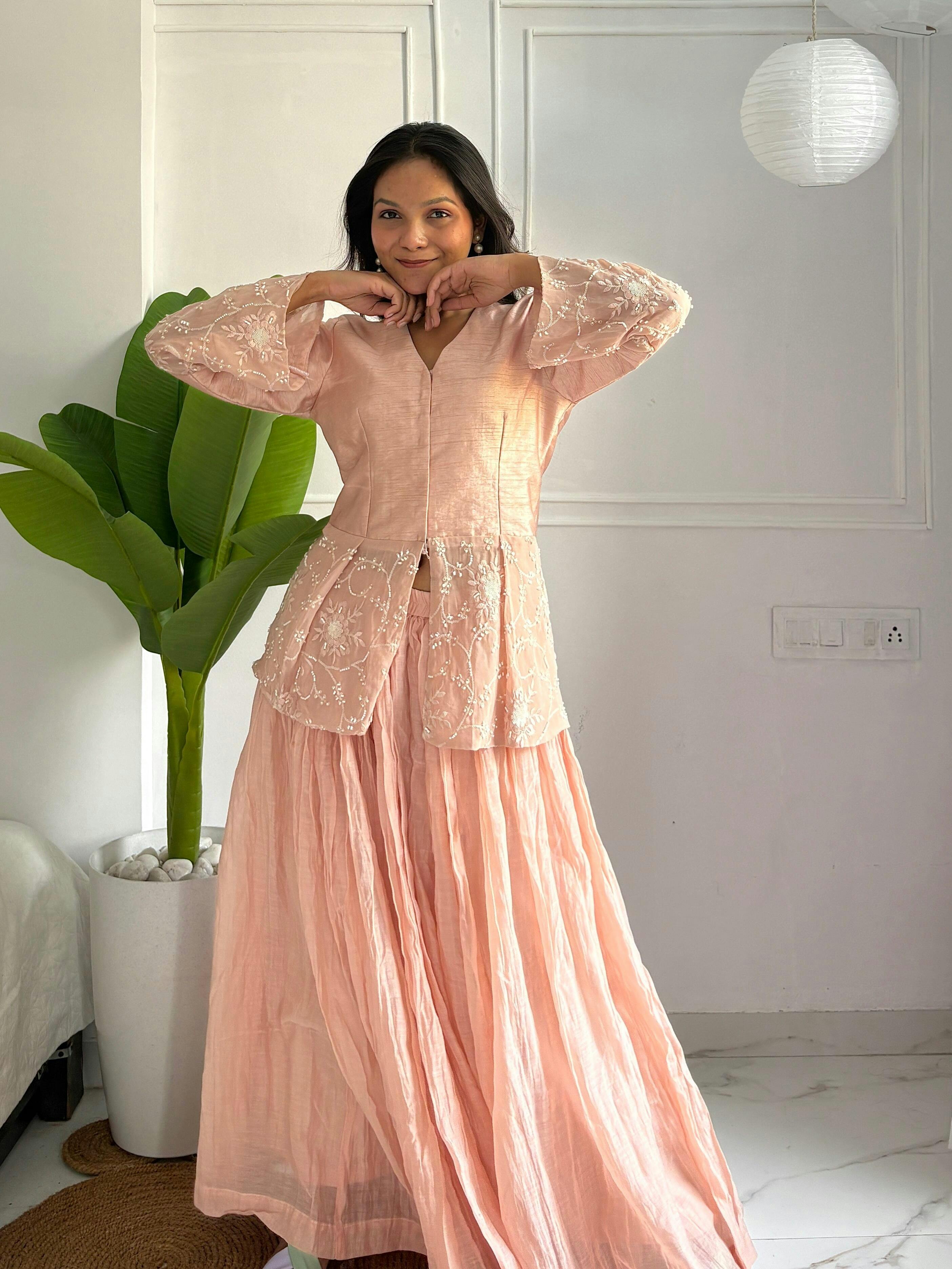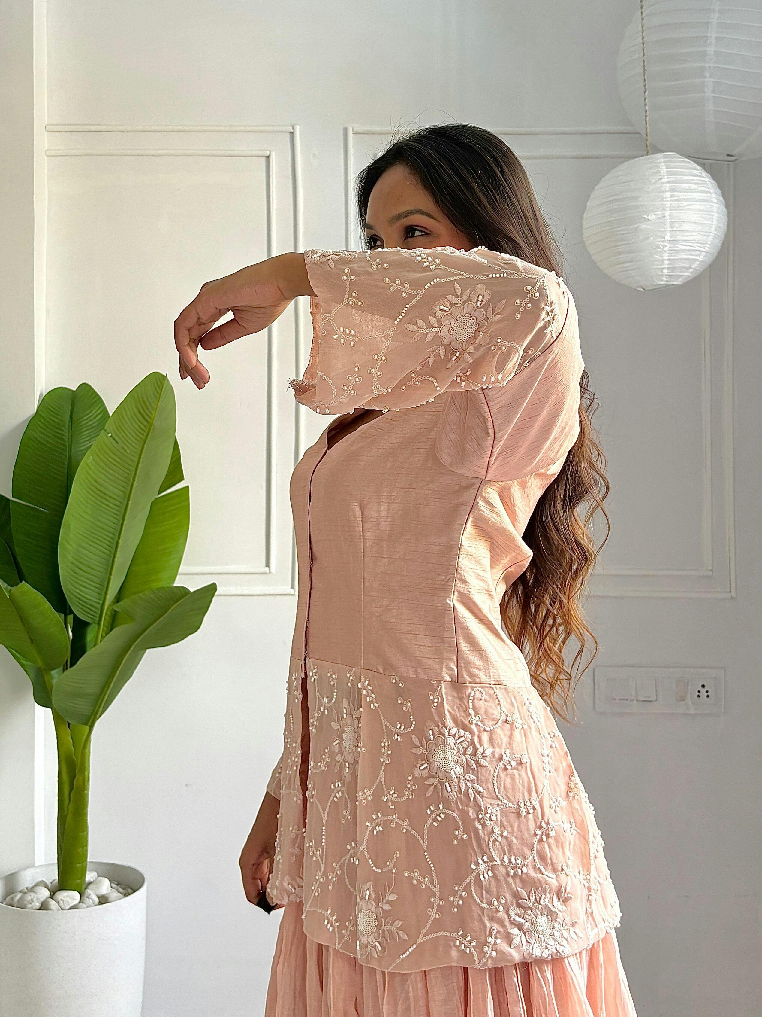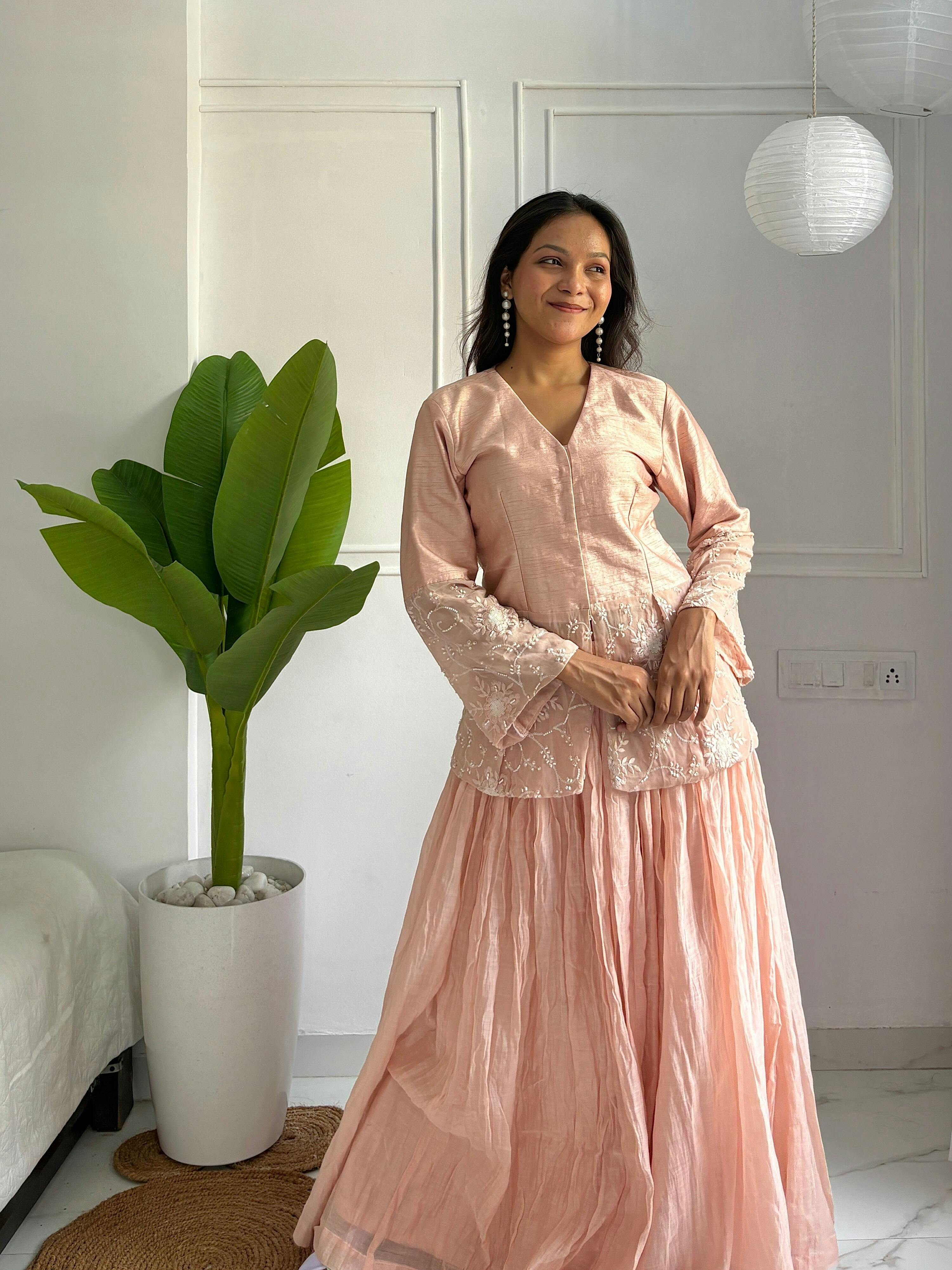 Product specialty : Peach Chanderi Lehenga & Choli -2.0 Edition by Uttarraa Fashion Pvt. Wrap yourself in soft elegance with our Peach Chanderi Lehenga & Choli – 2.0 Edition, crafted to make you glow with effortless grace. The ensemble features a beautifully tailored peach choli, adorned with intricate hand embroidery and delicate beadwork on sheer panels, adding dreamy sophistication. Paired with a flowing, pleated Chanderi lehenga that’s both lightweight and luxurious, this set is perfect for pre-wedding festivities, cocktail evenings, or intimate celebrations.