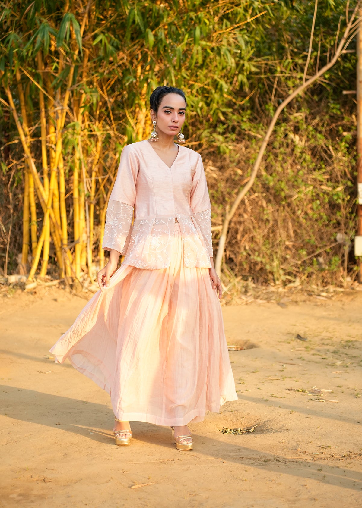 Style this gorgeous lehenga with bold statement jhumkas or pearl chandbalis to enhance its elegance. Pair it with nude or gold heels and a simple clutch to keep the look refined and classy. For makeup, go for dewy skin with soft peach blush, shimmery eyes, and a subtle rose or nude lipstick. Let your hair flow in soft curls or tie it into a sleek bun to highlight the neckline and earrings.