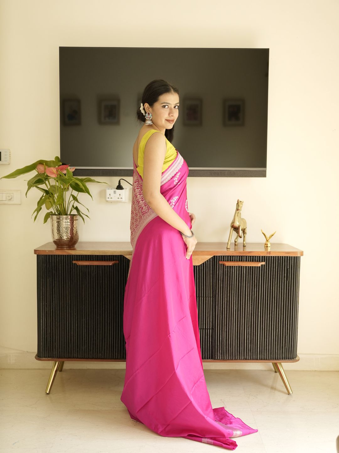 To ensure a sleek and polished look with this modern saree, choose a fitted, lightweight petticoat in a neutral tone of Pink, which won’t distract from the saree’s vibrancy. The saree should be draped with crisp pleats at the waist, and the pallu should fall gracefully over the shoulder, with minimal pinning to allow the fabric to flow naturally. A form-fitting blouse, preferably with a modern cut like a halter or keyhole neckline, will keep the look streamlined and stylish.