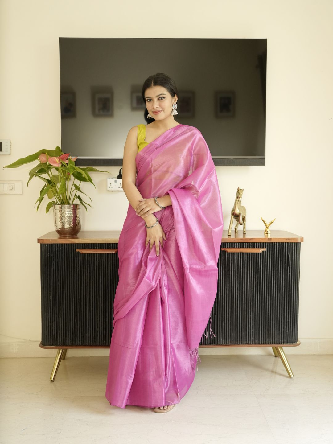 Product specialty : Drape yourself in quiet elegance with this Glass Tissue Silk Saree. Lightweight and breathable, this saree is perfect for festive events, intimate gatherings, or artistic celebrations. A perfect blend of simplicity and storytelling.