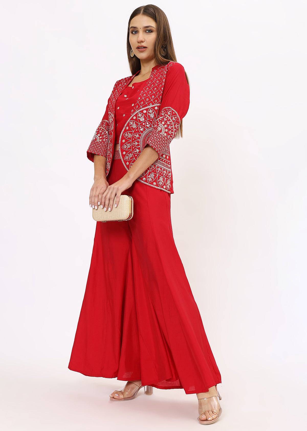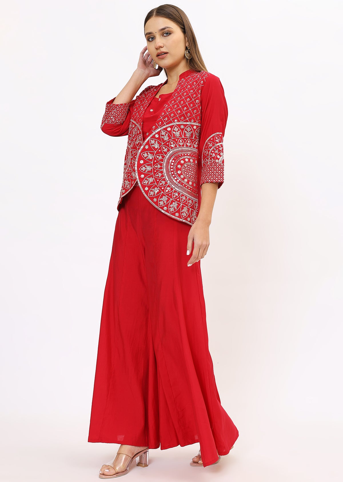 Designed for a flattering fit, the lehenga offers a flowy silhouette, while the tailored choli provides a structured yet comfortable feel. The jacket adds an extra layer of elegance, making it perfect for all body types. Pair it with statement jewelry and embellished footwear to complete your royal look.