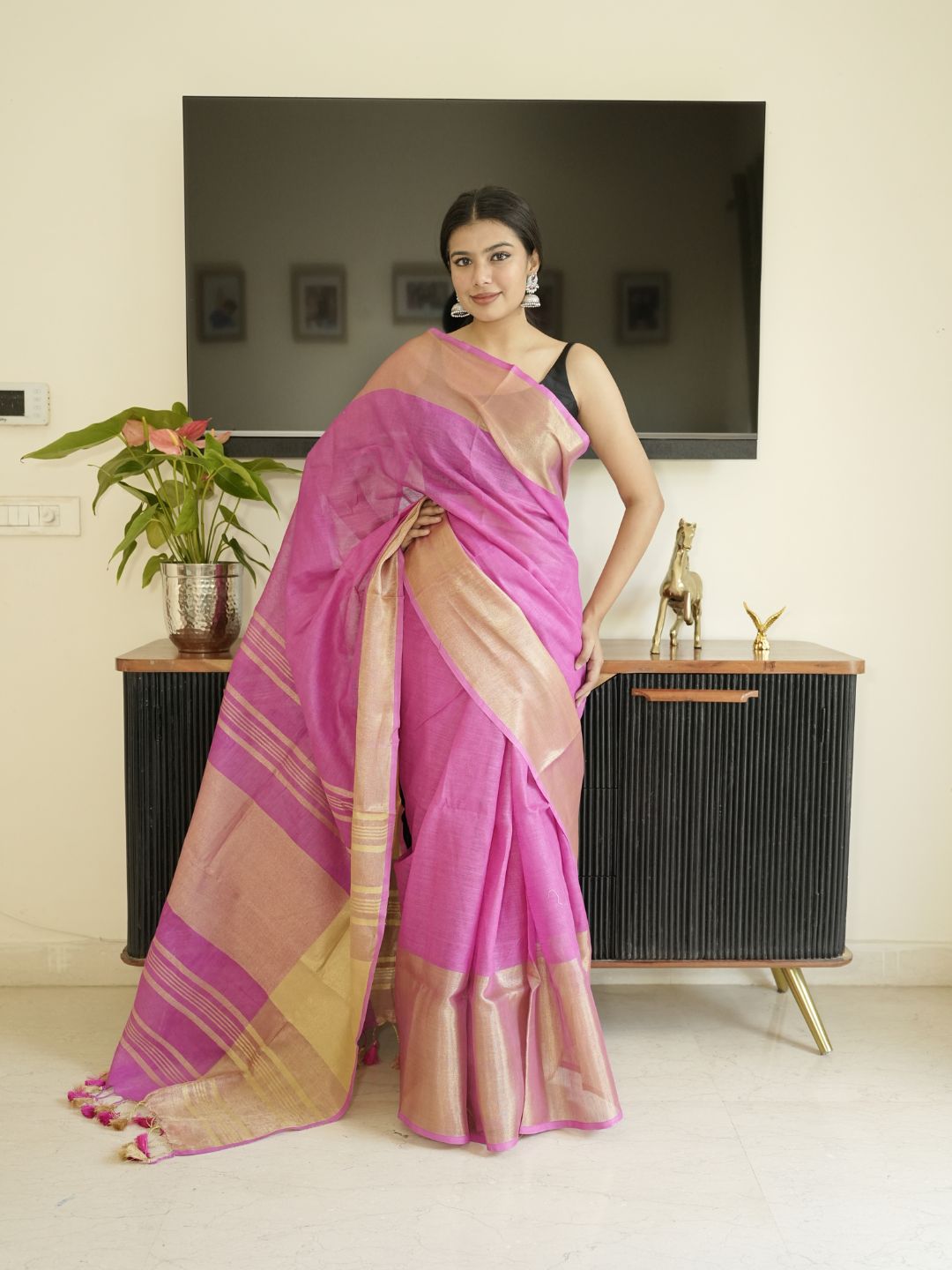 Product specialty : Drape yourself in quiet elegance with this Tissue Linen Saree. Lightweight and breathable, this saree is perfect for festive events, intimate gatherings, or artistic celebrations. A perfect blend of simplicity and storytelling.