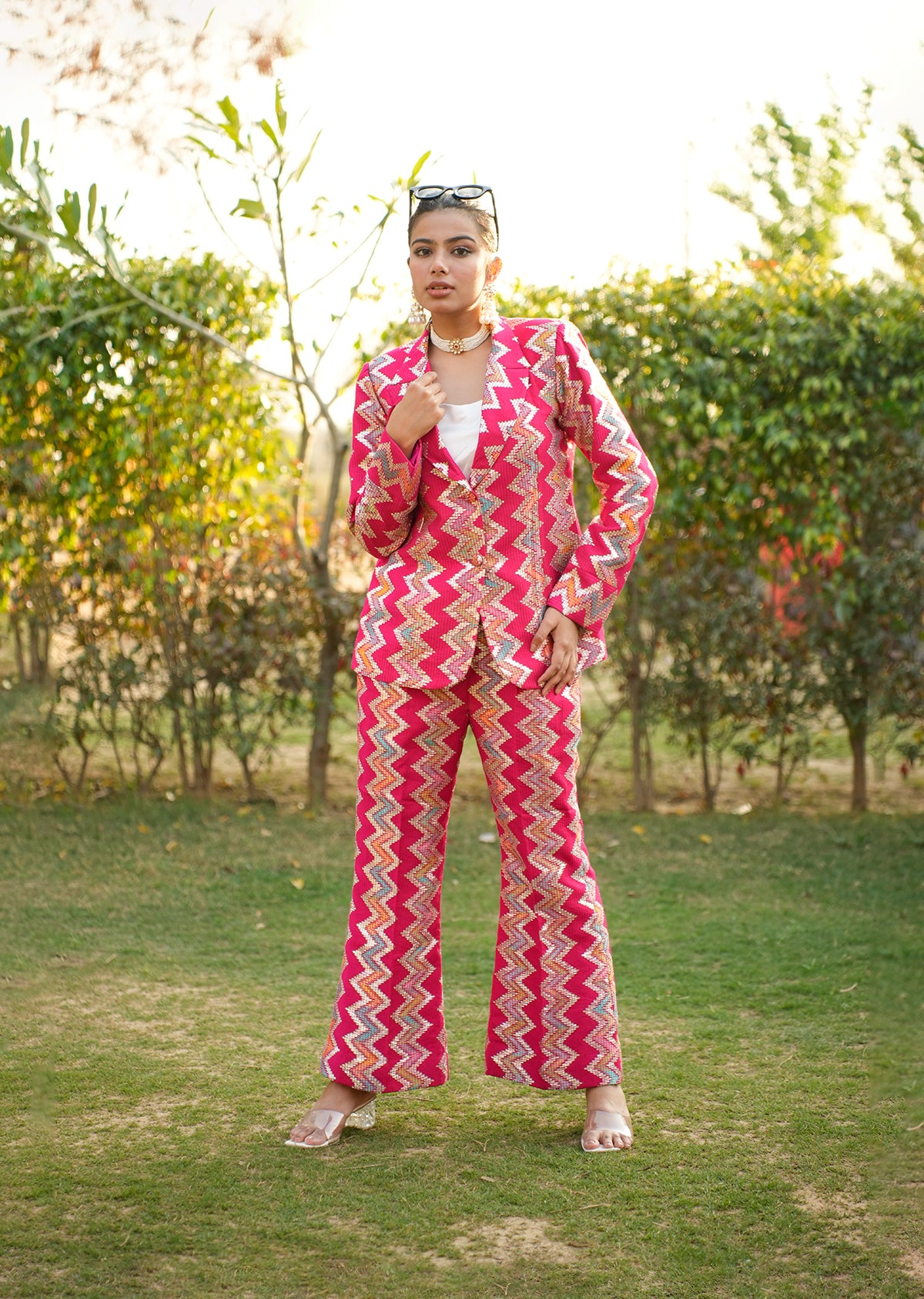 Product specialty :Turn heads in the Pink Zari Embroidered Blazer & Pants by Uttarraa Fashions Pvt. Ltd. This contemporary masterpiece blends tradition with modern sophistication, making it a go-to choice for fashion-forward women. Designed with intricate zari embroidery, this ensemble is perfect for festive celebrations, cocktail parties, and power dressing with a cultural twist.