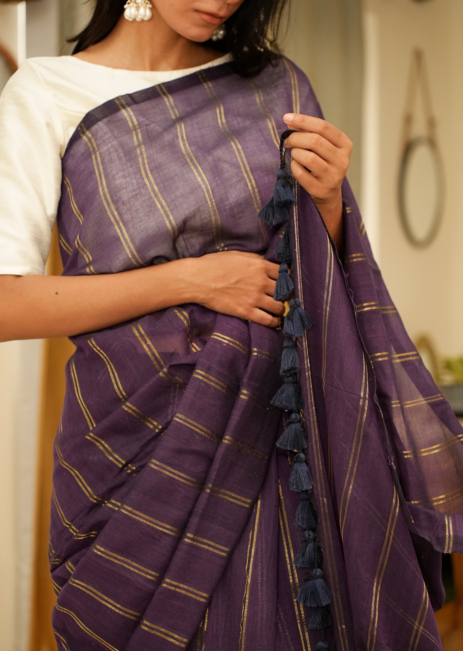 Purple Mul Cotton Saree with Zari Stripes & Tassel Pallu