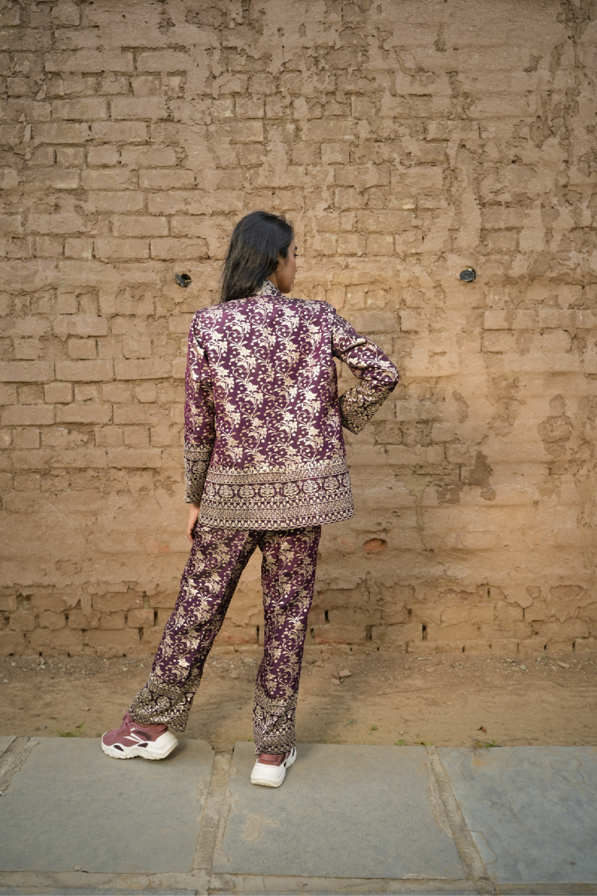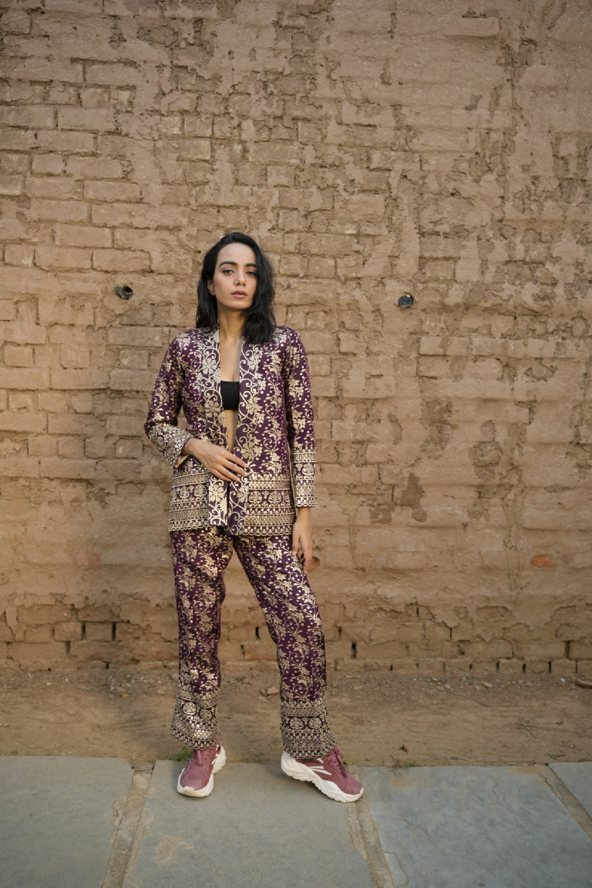 Pair this purple brocade coat set with statement gold jewelry, pointed heels, and a sleek clutch. Style your hair in soft waves or a low bun, and add a bold lip color for a luxurious, festive-ready look.