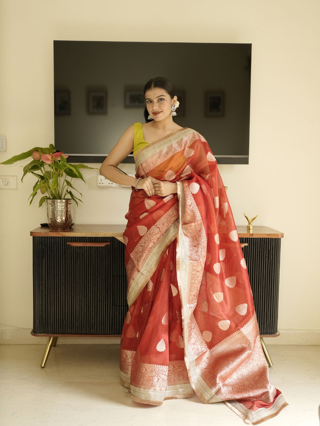 Product specialty : Drape yourself in quiet elegance with this Banarasi Saree. Lightweight and breathable, this saree is perfect for festive events, intimate gatherings, or artistic celebrations. A perfect blend of simplicity and storytelling.