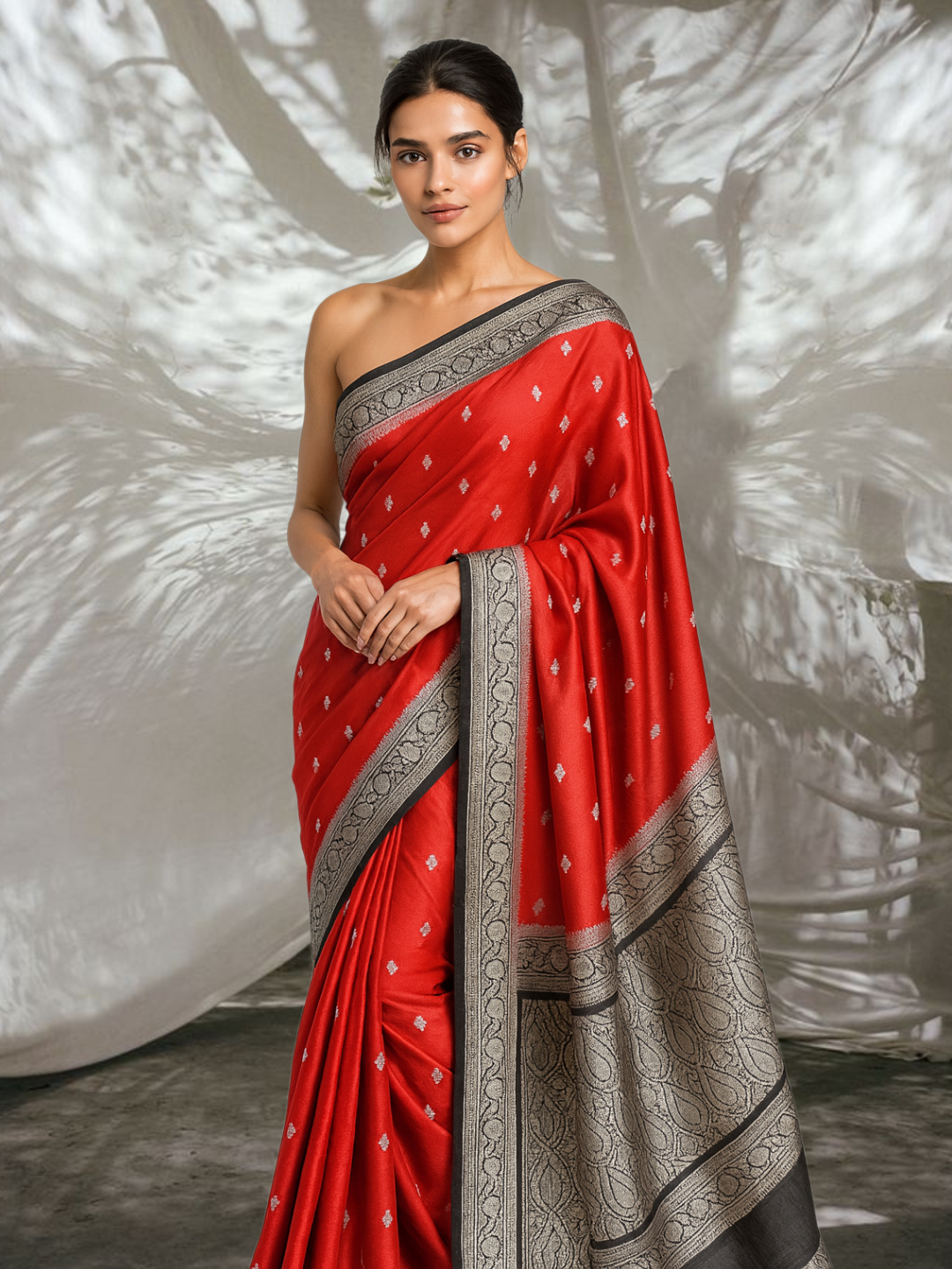 Product specialty : Drape yourself in quiet elegance with this Banarasi Saree. Lightweight and breathable, this saree is perfect for festive events, intimate gatherings, or artistic celebrations. A perfect blend of simplicity and storytelling.