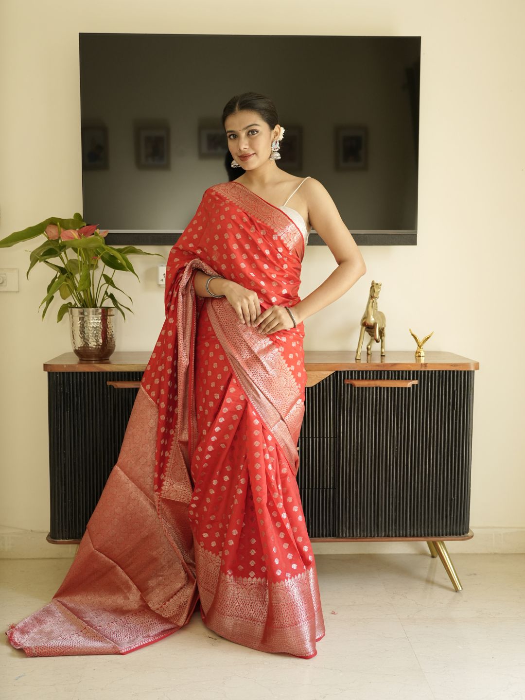 To ensure a sleek and polished look with this modern saree, choose a fitted, lightweight petticoat in a neutral tone of Red, which won’t distract from the saree’s vibrancy. The saree should be draped with crisp pleats at the waist, and the pallu should fall gracefully over the shoulder, with minimal pinning to allow the fabric to flow naturally. A form-fitting blouse, preferably with a modern cut like a halter or keyhole neckline, will keep the look streamlined and stylish.