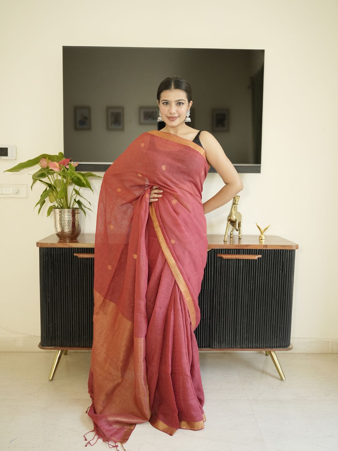 Product specialty : Drape yourself in quiet elegance with this Linen Silk Saree. Lightweight and breathable, this saree is perfect for festive events, intimate gatherings, or artistic celebrations. A perfect blend of simplicity and storytelling.