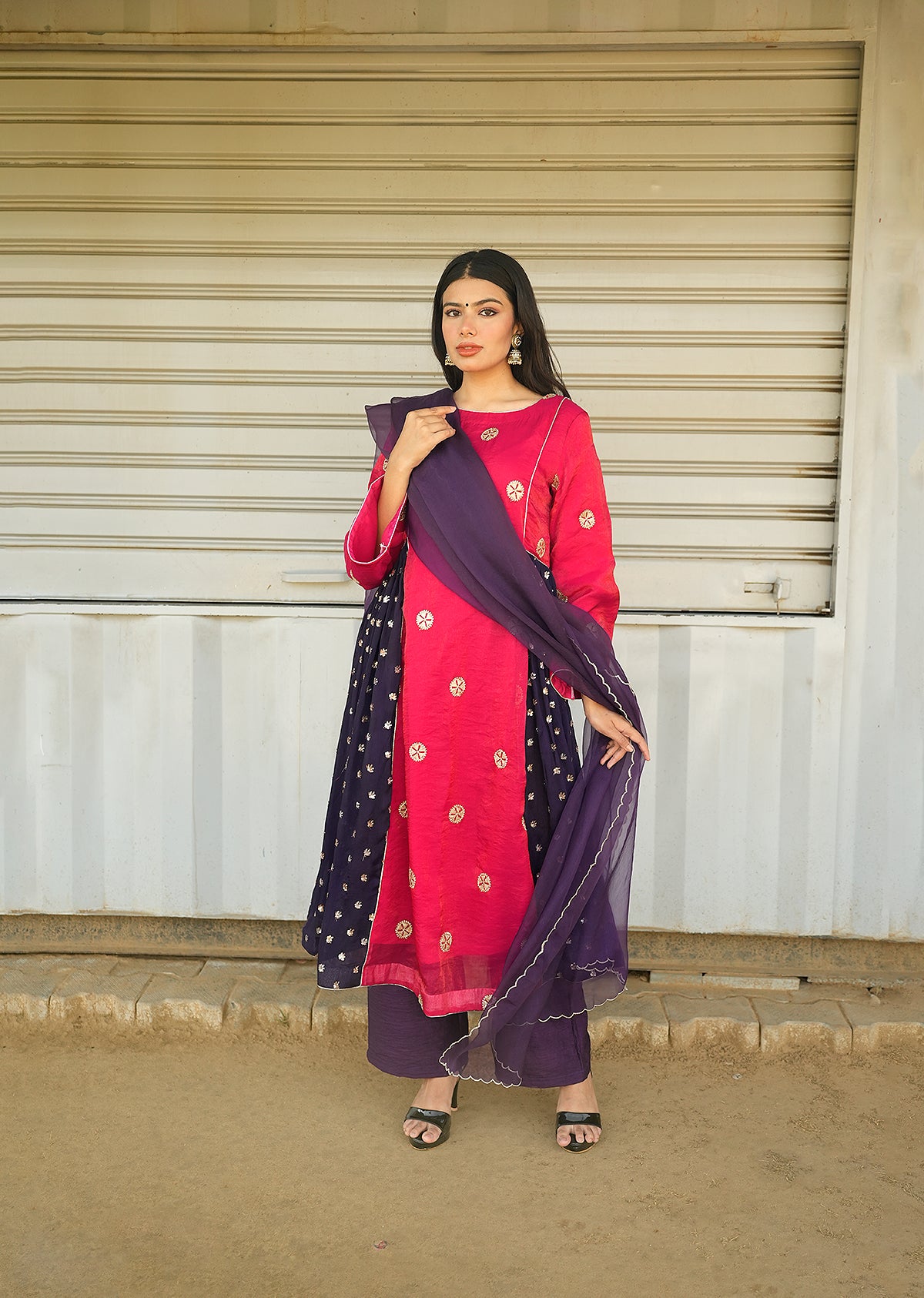 Product specialty : Step into elegance with the Red & Purple Shimmer Kurta Set with Dupatta by Uttarraa Fashions Pvt. Ltd. Designed for the modern woman who cherishes tradition, this ensemble is a perfect fusion of luxury and comfort. Featuring a stunning red kurta adorned with intricate embroidery, paired with contrast purple pants and a matching dupatta, this set is an ideal choice for festive occasions and celebrations.
