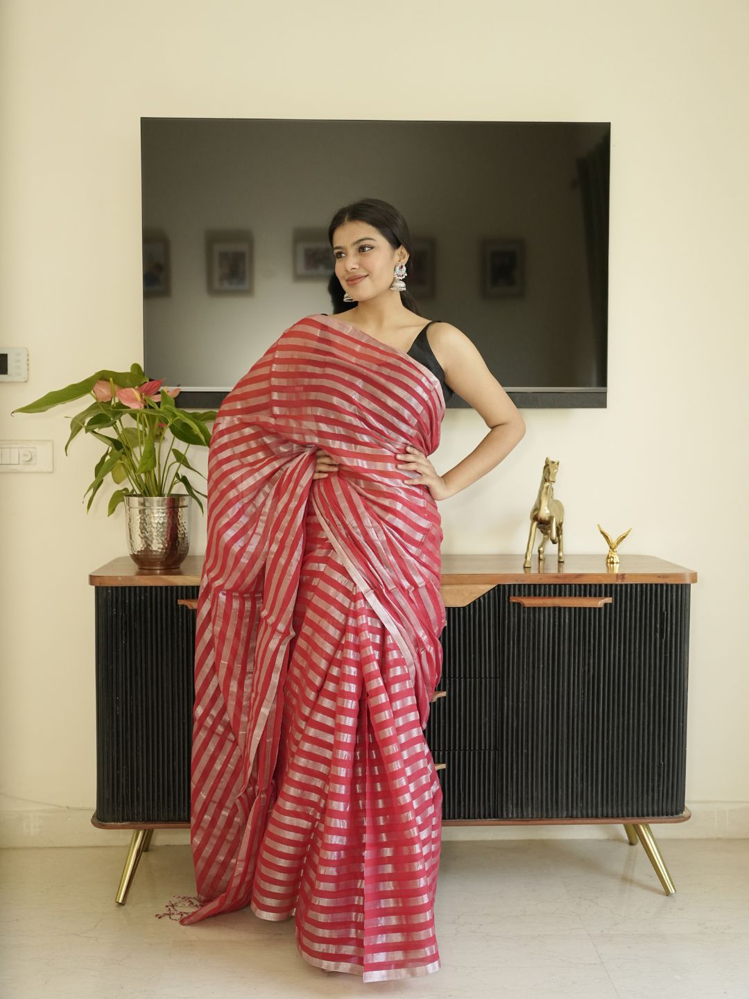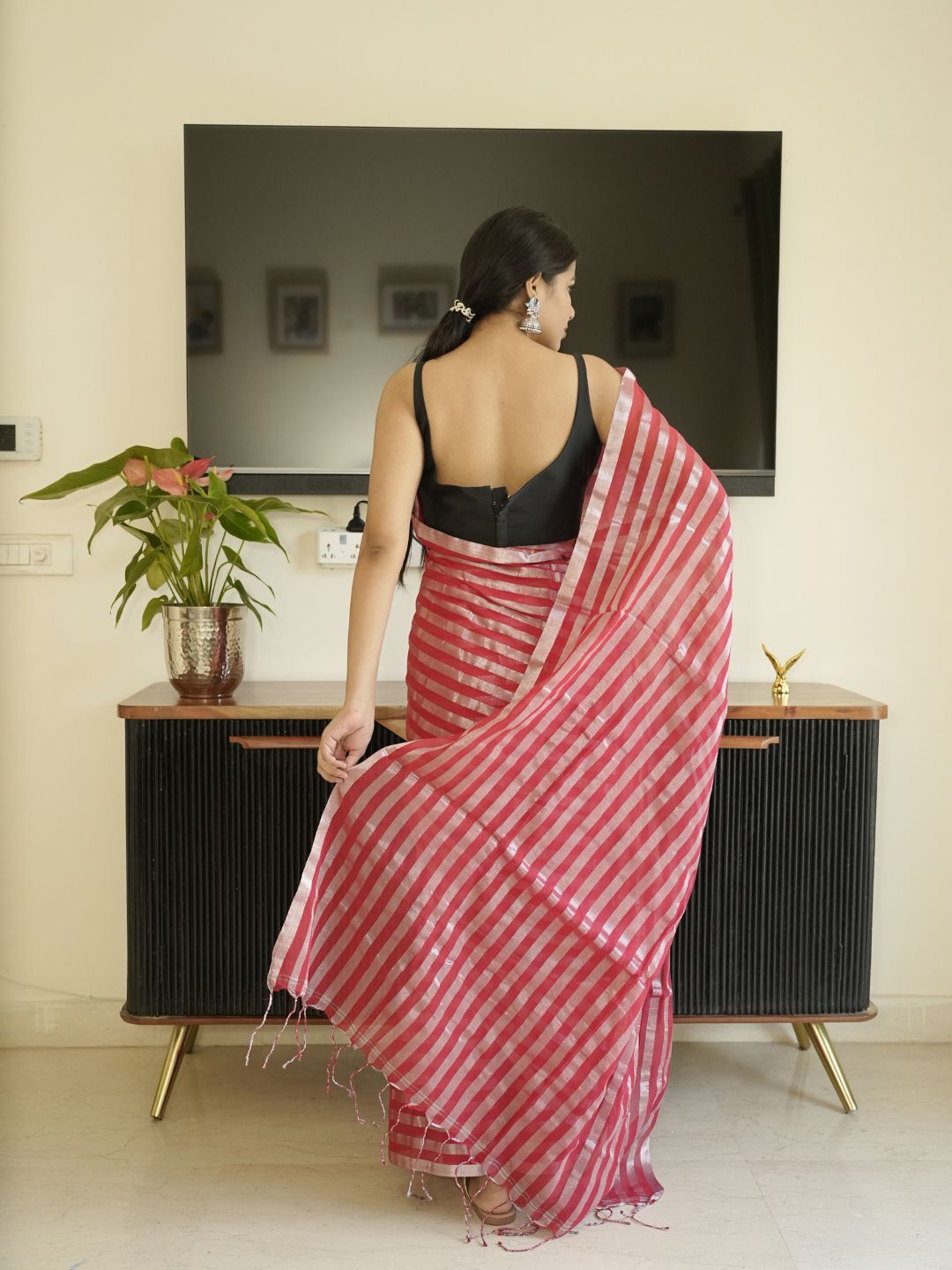 To ensure a sleek and polished look with this modern saree, choose a fitted, lightweight petticoat in a neutral tone of Red, which won’t distract from the saree’s vibrancy. The saree should be draped with crisp pleats at the waist, and the pallu should fall gracefully over the shoulder, with minimal pinning to allow the fabric to flow naturally. A form-fitting blouse, preferably with a modern cut like a halter or keyhole neckline, will keep the look streamlined and stylish.