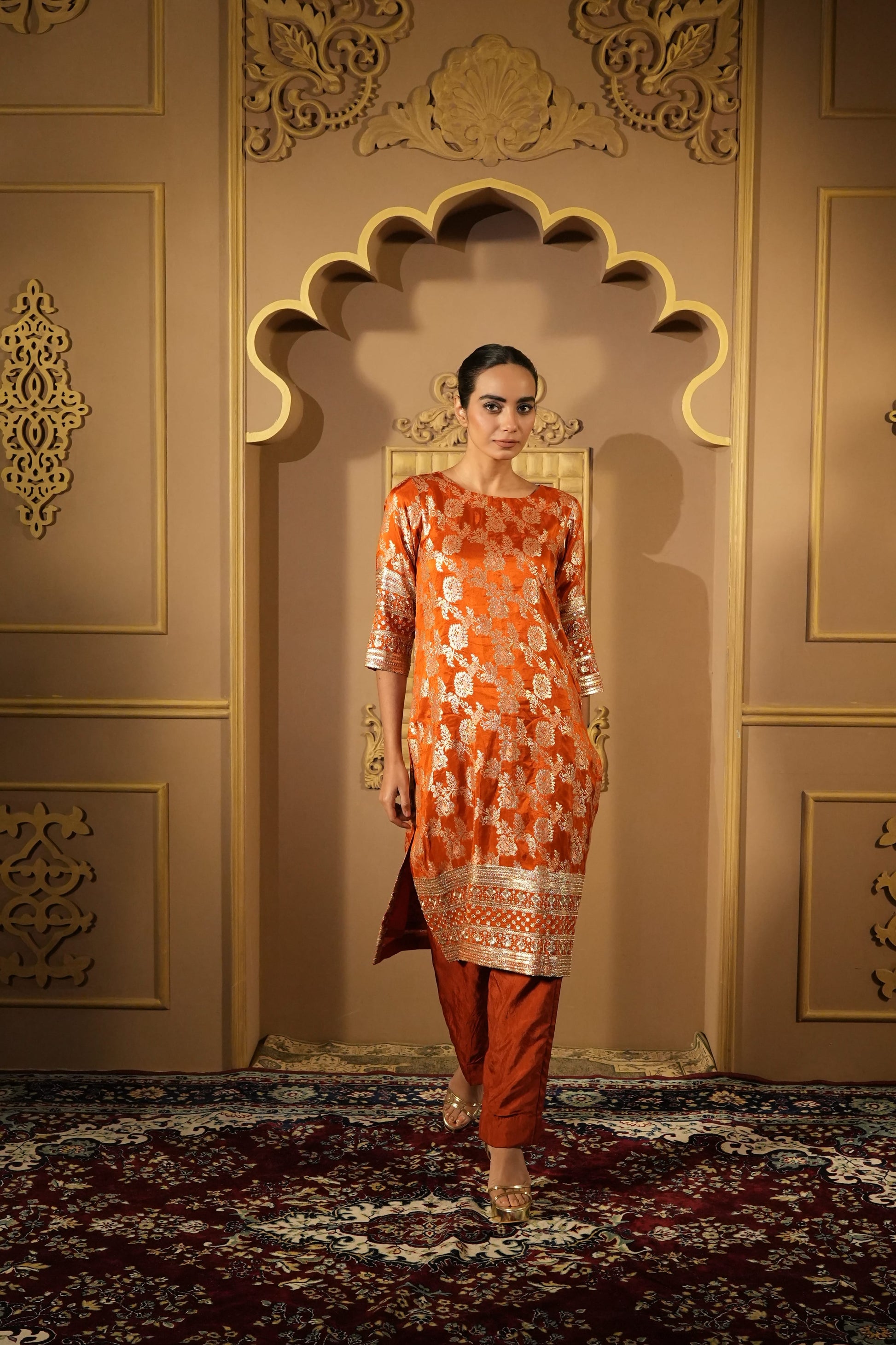 Product Specialty: Embrace timeless elegance with the Rust Orange Royal Bloom Brocade Kurta from Uttarraa Fashions Pvt. Ltd. This stunning piece showcases intricate brocade work, exuding a regal charm perfect for festive and special occasions. The rich rust-orange hue, combined with detailed craftsmanship, creates an opulent yet sophisticated look. Designed to make a statement, this kurta is a blend of tradition and modern grace, ensuring you leave a lasting impression wherever you go.