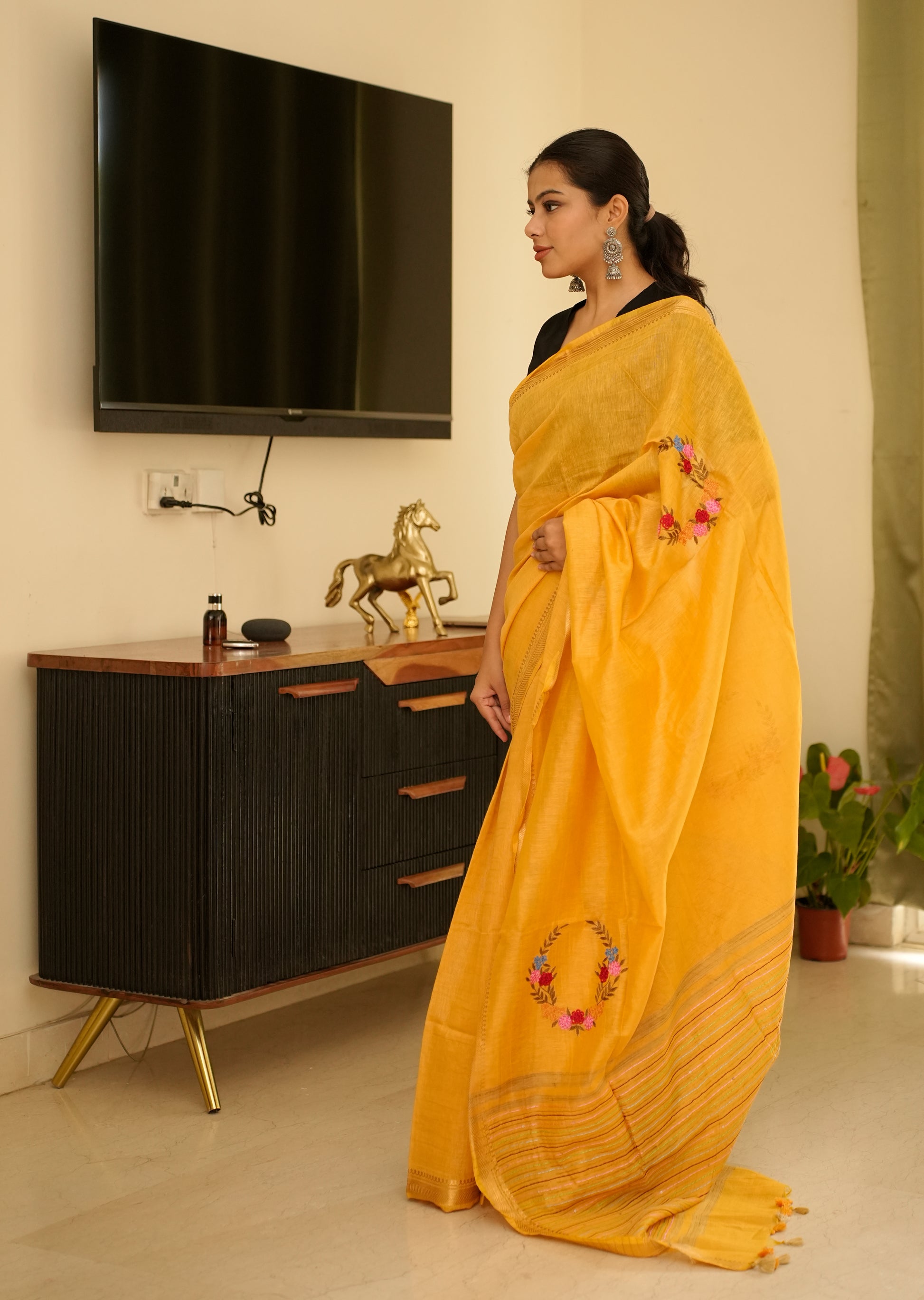 Sunlit Mustard Linen Saree with Zari Border & Floral Embroidery