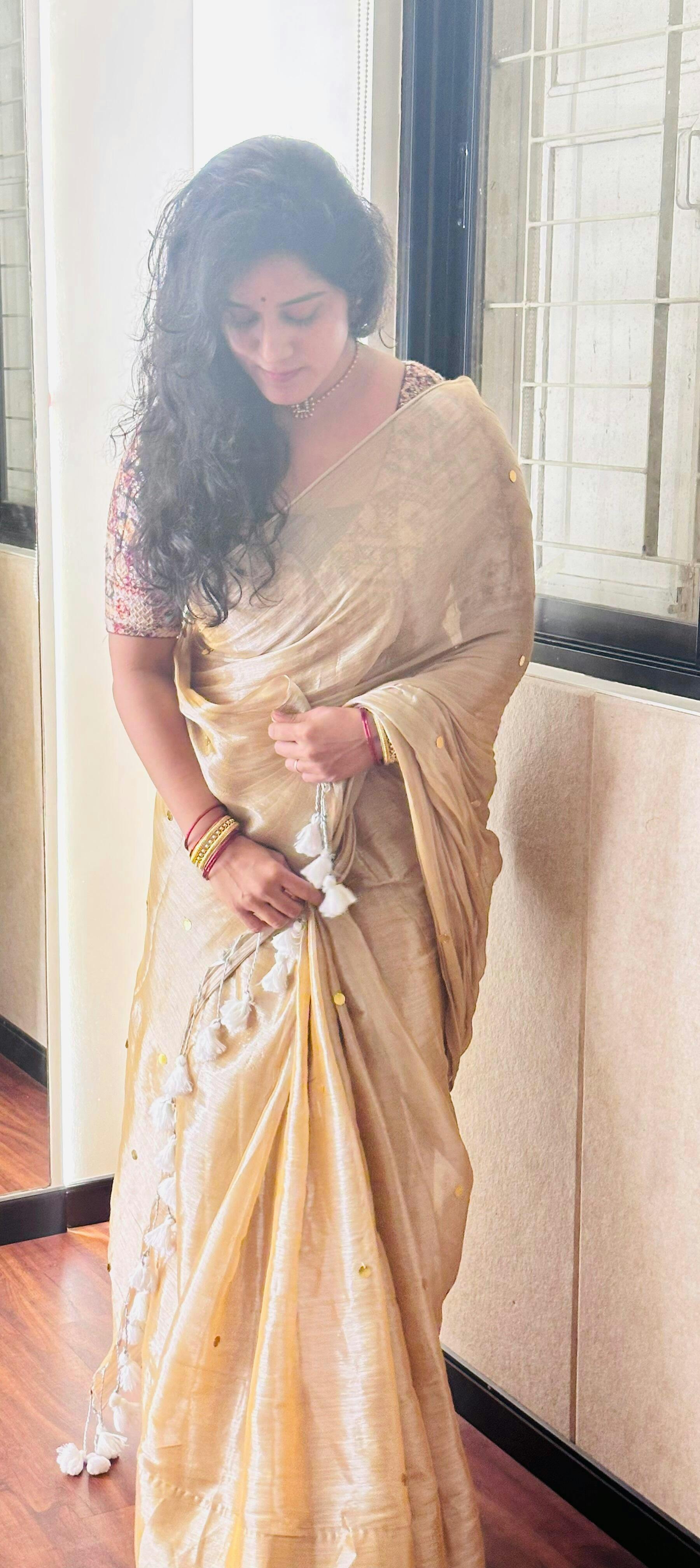 Product specialty : A vision in soft shimmer, Whispers of Ivory is a handwoven silk saree in a muted beige-gold tone, adorned with delicate golden butis and playful tassels. This understated ensemble blends quiet luxury with a modern aesthetic, styled effortlessly with a classic black blouse. Ideal for intimate gatherings, day weddings, or minimalist festive looks, it’s a timeless drape for the woman who speaks volumes in subtlety.